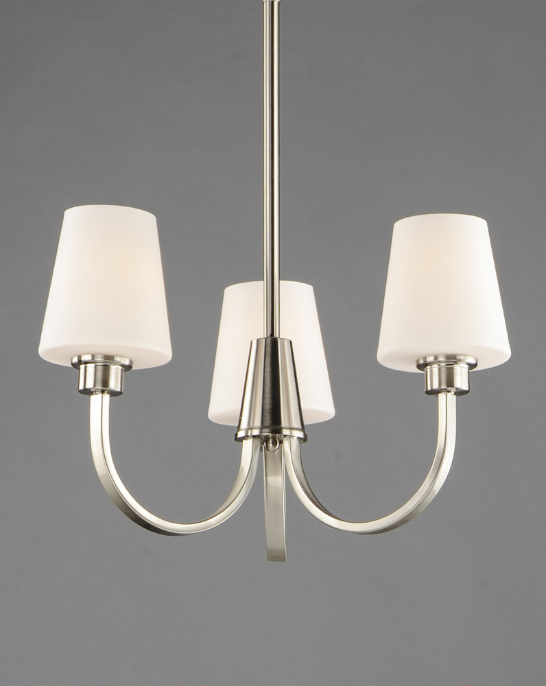 Graceful arcs of rectangular tubing transition to round cups that support tapered Satin White glass shades creating a crisp and clean transitional design. The frame is finished in your choice of Satin Nickel or Black which bridges modern and transitional d