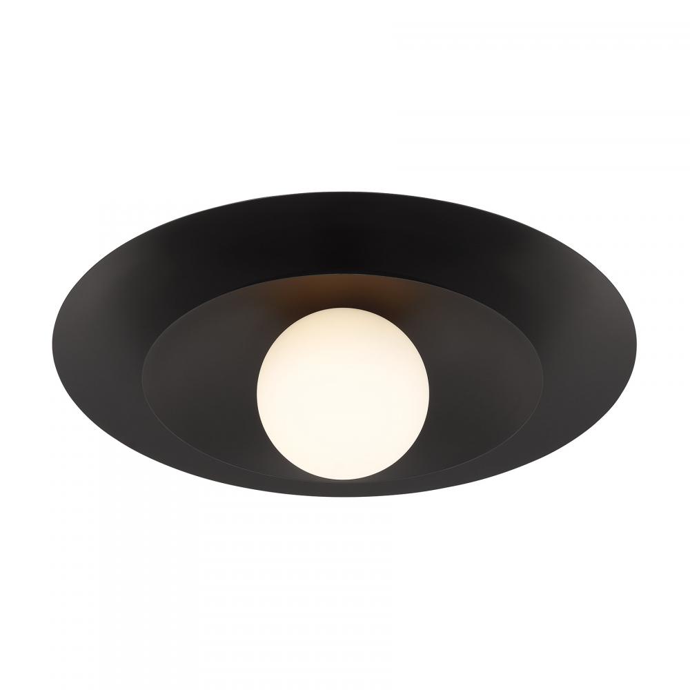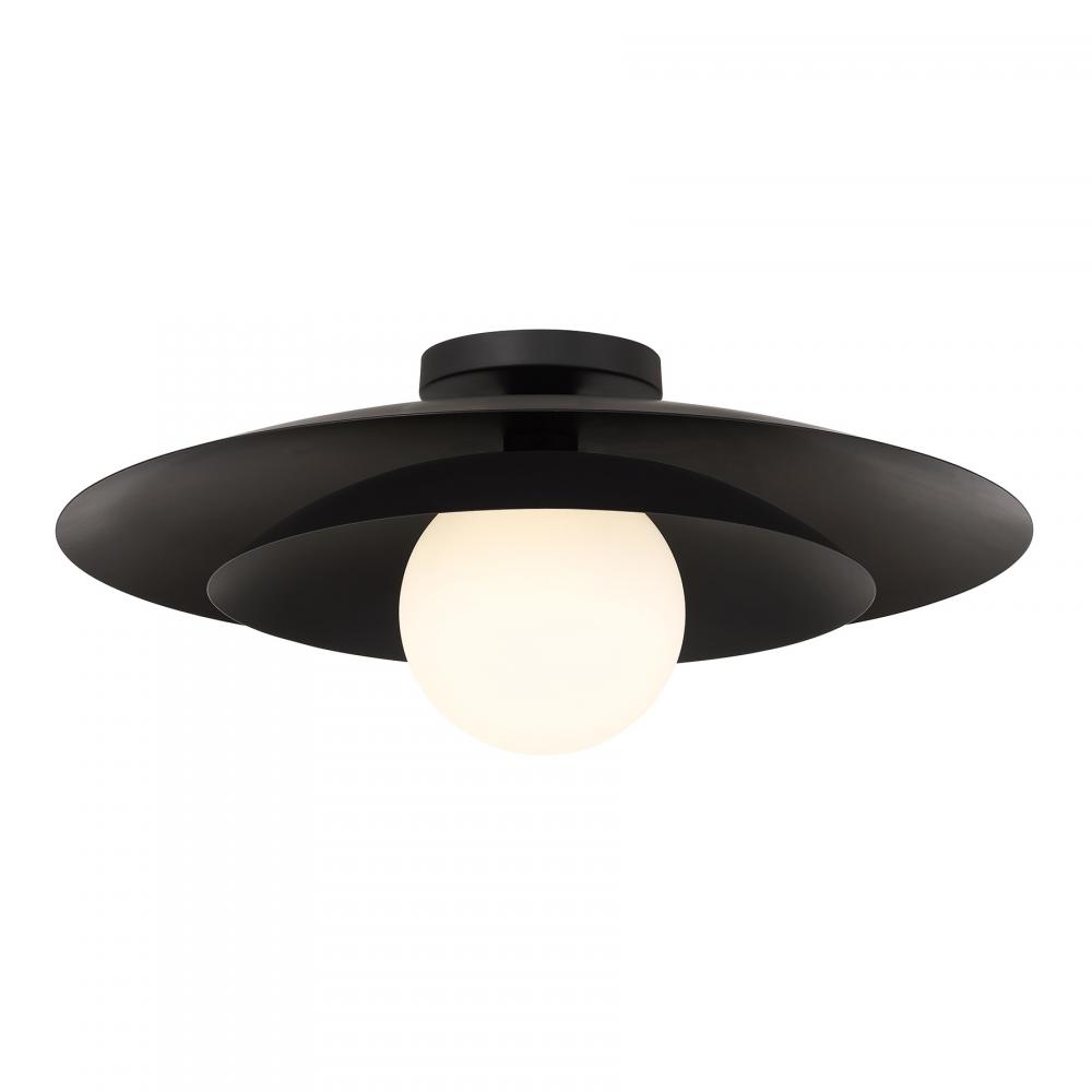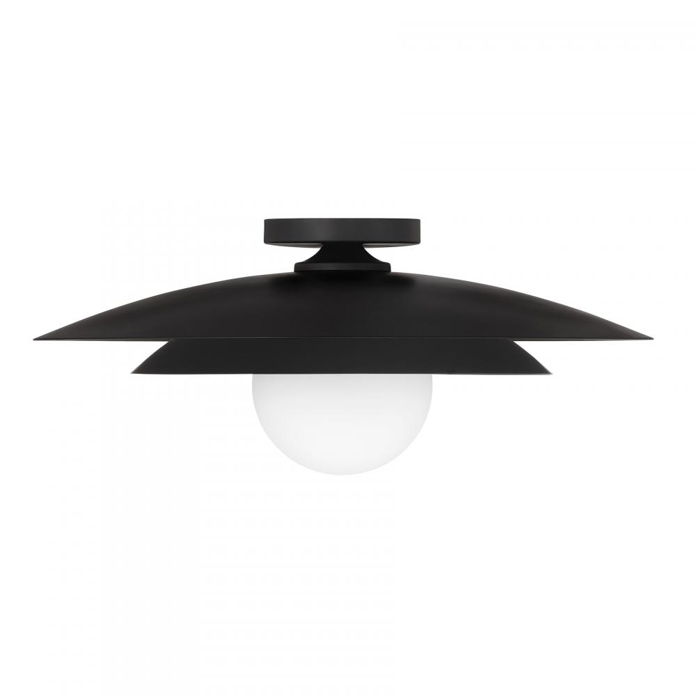 The Savoy House Sherrer 1-light ceiling semi-flush mount allows you to bring an icon of midcentury modern style into any room! It showcases a louvered shade that concentrates and directs the light coming from the white opal glass globe. The Matte Black finish creates a bright and beautiful glow. Sherrer is 8.5" in height and 20" in width. It uses one candelabra size bulb of up to 60 watts. Bulb not included.