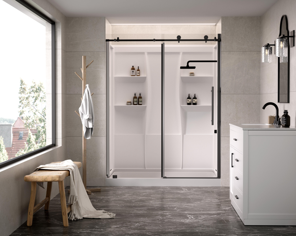 This three-piece acrylic shower wall surround offers built-in shelving for a clutter-free, organized bathing experience.