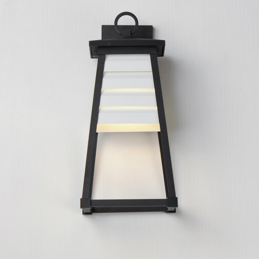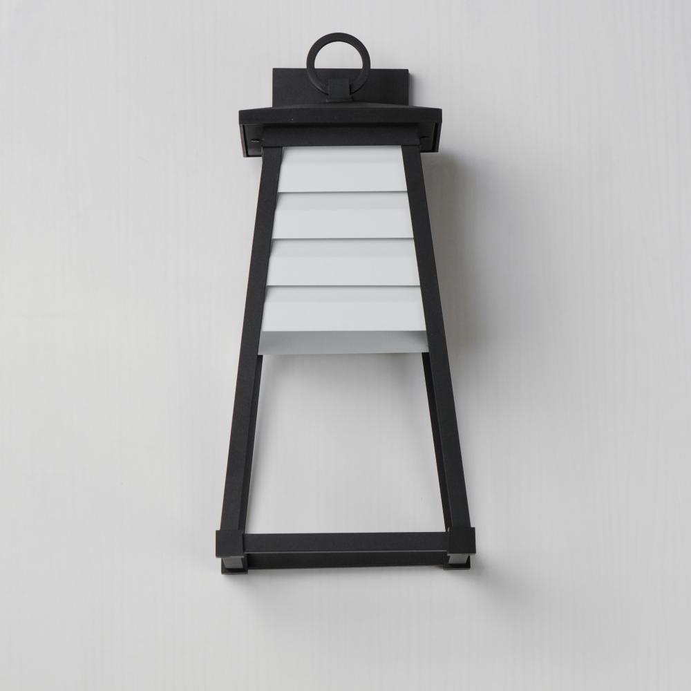 Contrasting louvered insets are set within Matte Black trapezoidal frames. The frames are made of Vivex so their finish will withstand harsher climates. The louvered panel insets are made of aluminum and feature a full cut-off design aesthetic making this
