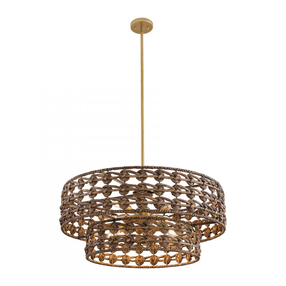The Savoy House Silencio 7-light pendant was designed by Breegan Jane, an award-winning interior designer and TV host. It has a traveled, storied feel that evokes the artisans who pour their hearts and souls into their work, no matter the medium. The shades are crafted from intricately knotted natural water hyacinth, a sustainable organic material that catches the eye and creates effortless serenity. A Riviera Brass finish adds an extra touch of bold style. Silencio is 30" in width and has an adjustable height ranging from 13" to 67". It uses seven candelabra size bulbs of up to 60 watts per bulb. Bulbs not included. Comes with four 12" downrods and one 6" downrod.