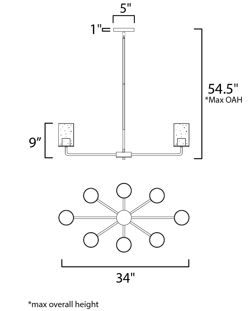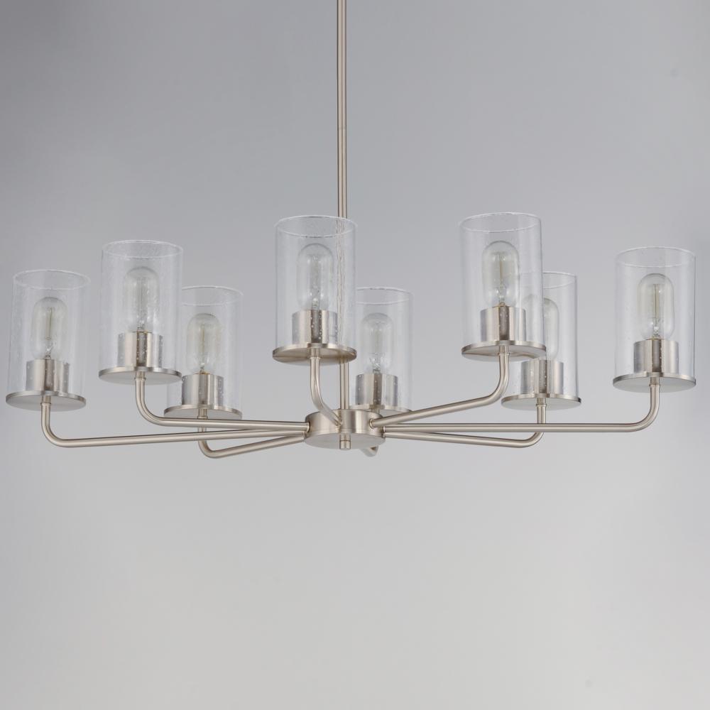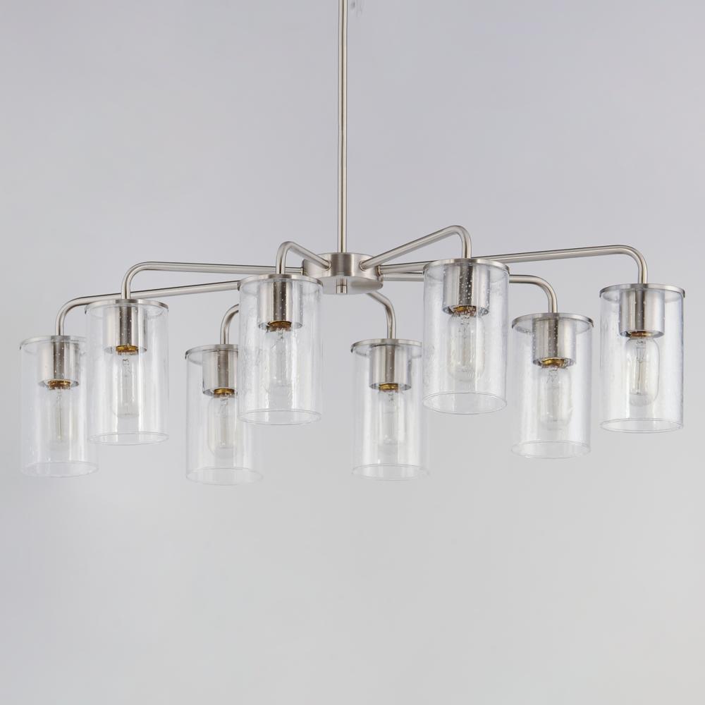 Cylinders in Clear Seeded glass on simple Satin Nickel frames or matte Black frames with Antiqued Brass socket covers. Pivoting arms on chandelier allow it to direct light up or down. Use filament lamps either tubular or Edison in shape for a Coastal or In