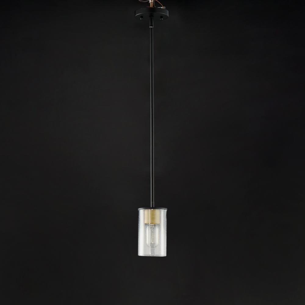 Cylinders in Clear Seeded glass on simple Satin Nickel frames or matte Black frames with Antiqued Brass socket covers. Pivoting arms on chandelier allow it to direct light up or down. Use filament lamps either tubular or Edison in shape for a Coastal or In