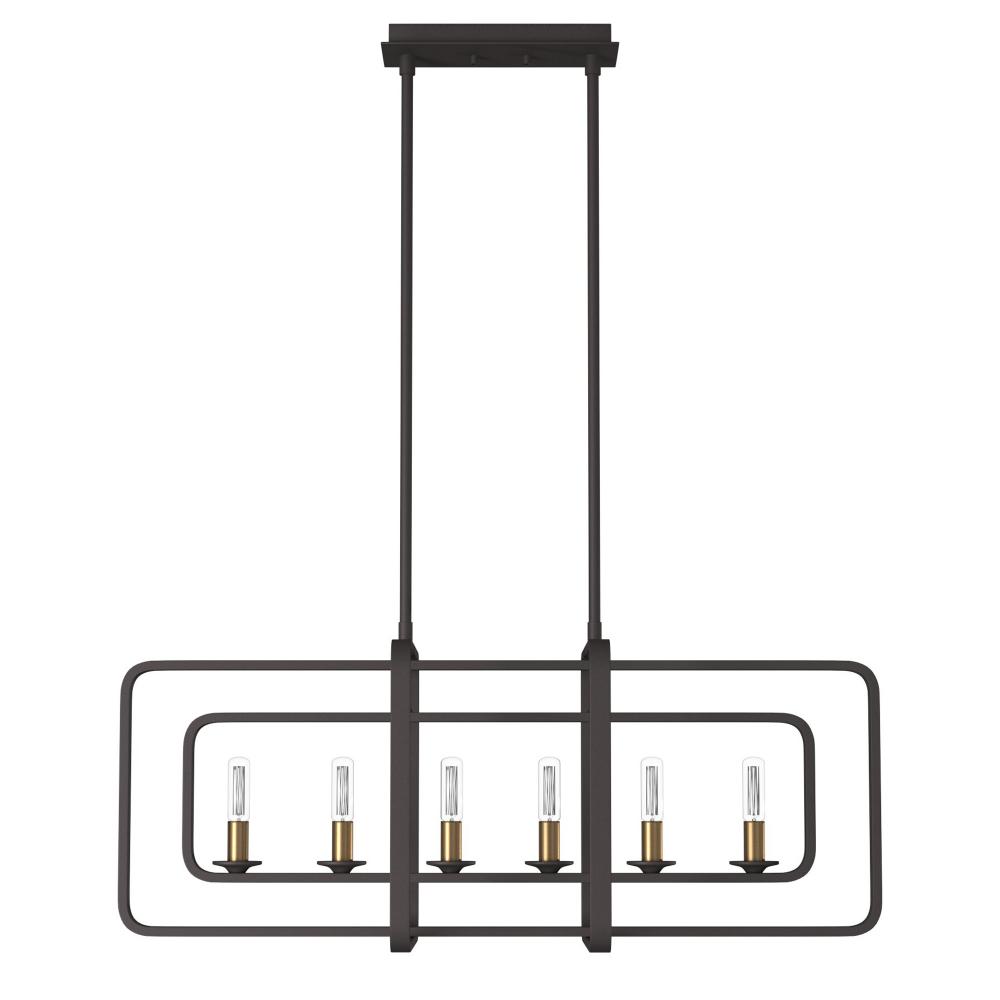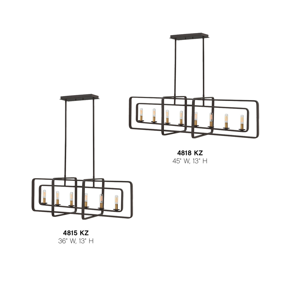 Quentin is constructed of angular forms that create a striking geometric interplay. This stem-hung collection features intersecting rectangles in a bold Buckeye Bronze finish, forming a modern silhouette. Candle sleeves in Heritage Brass add a distinctively vintage feel that is both hip and historical.