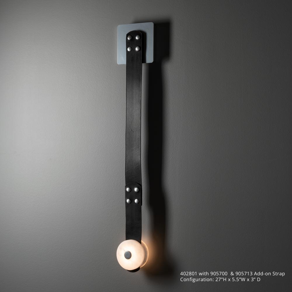 Part of the ART + ALCHEMY by Hubbardton Forge Collection, the SNAPS LED Sconce features a single alabaster-LED module with a fine leather strap and small, square steel wall mount. Designed by HF's Andy Morter, the white alabaster stone's translucence brings to light its natural variances and exquisite beauty.