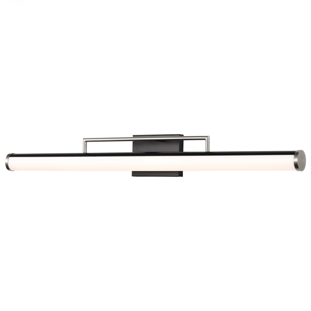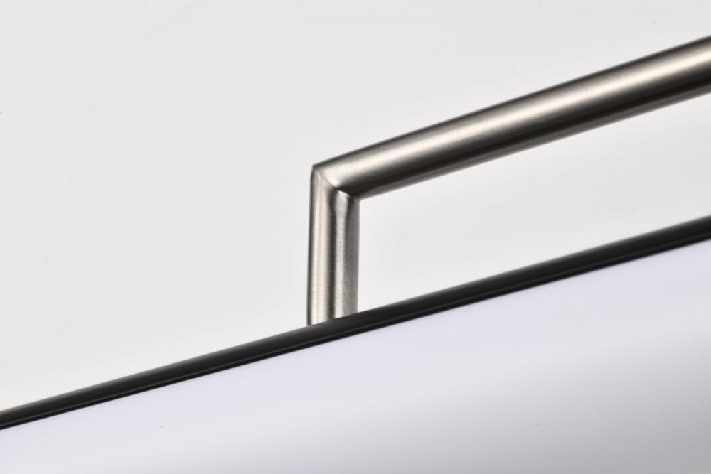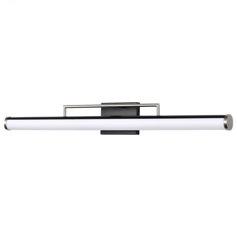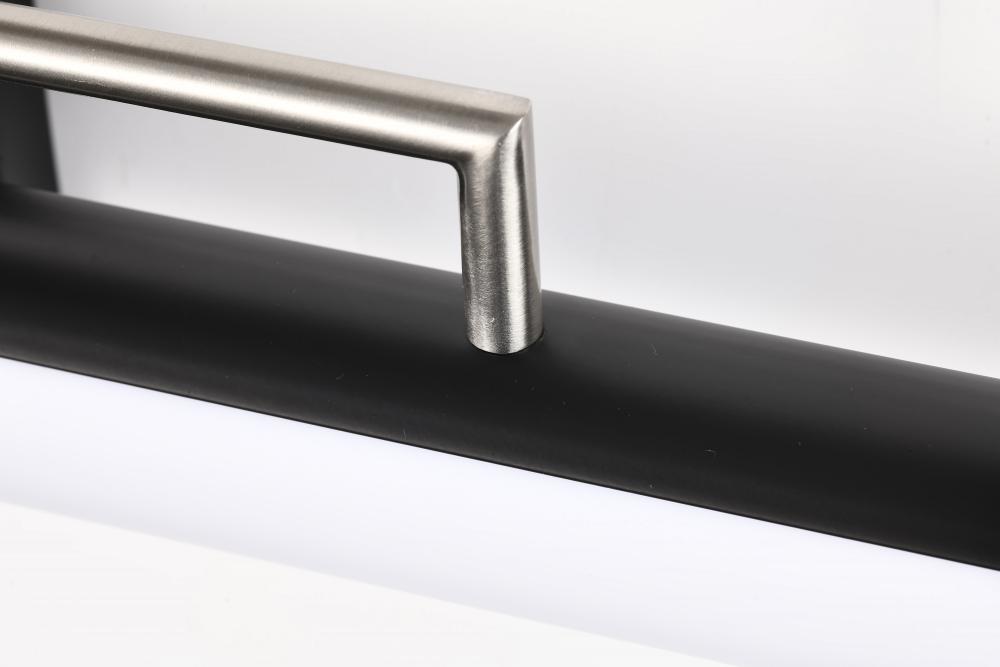 The design of the Solano 62-659 integrated LED large bathroom vanity light is sleek and minimalist, with a simple yet elegant shape. The stylish fixture is finished in black with brushed nickel accents that accentuate the clean lines and broad backplate. A