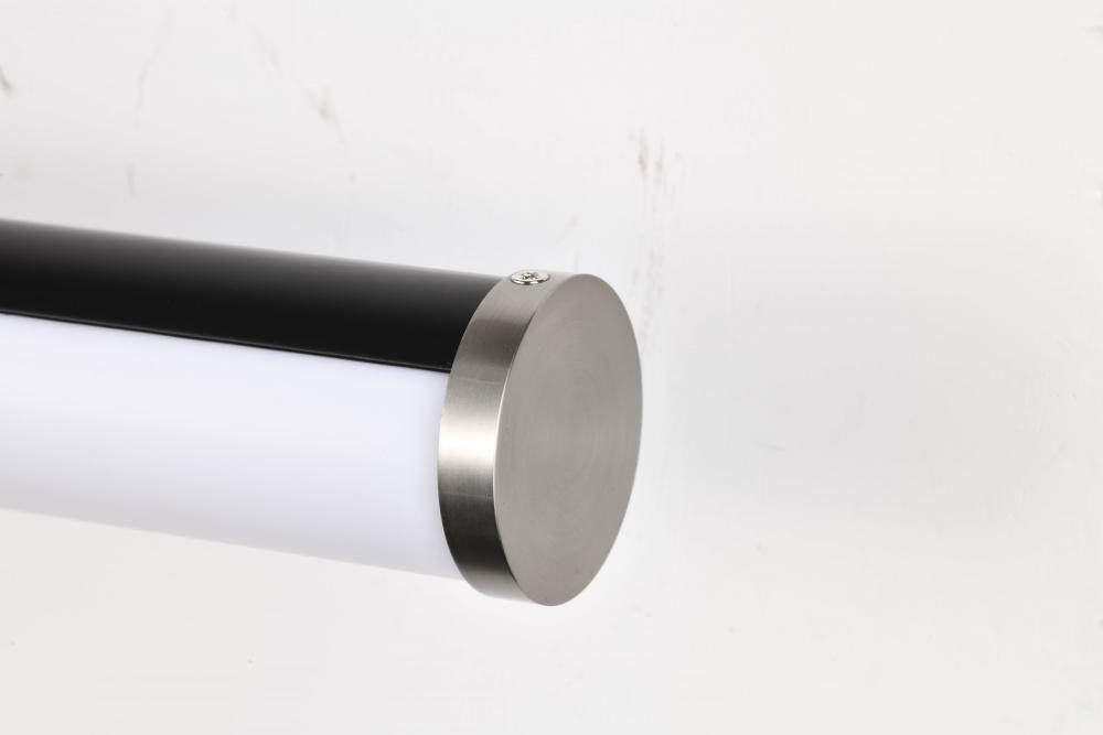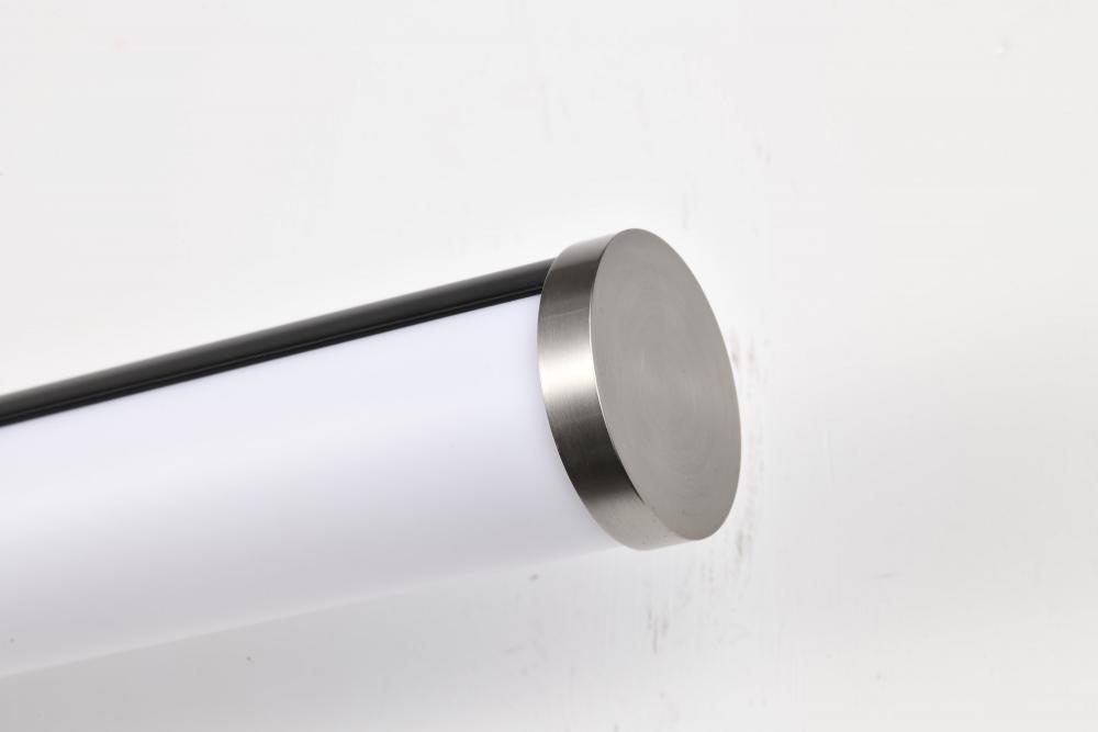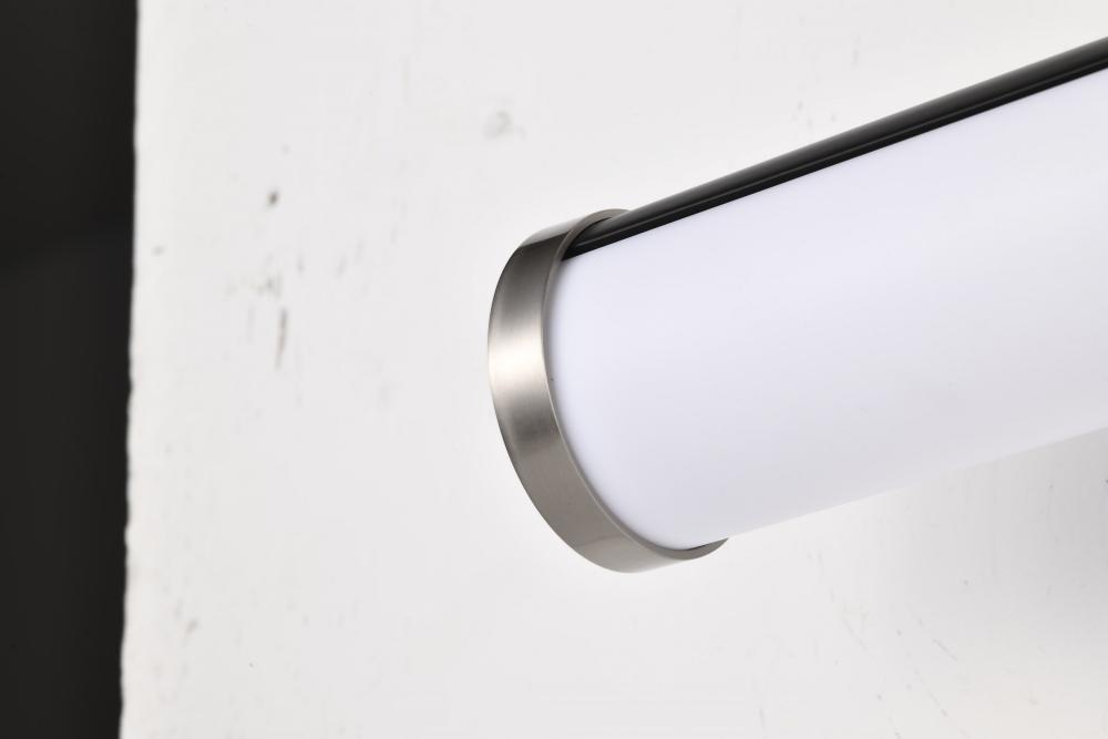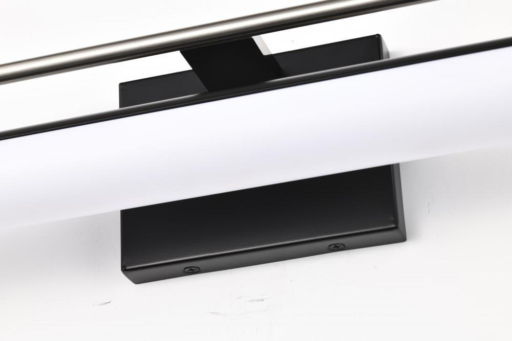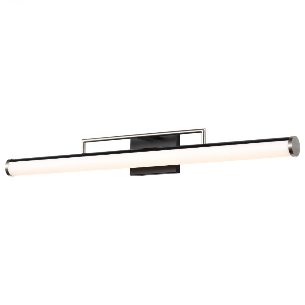 The design of the Solano 62-659 integrated LED large bathroom vanity light is sleek and minimalist, with a simple yet elegant shape. The stylish fixture is finished in black with brushed nickel accents that accentuate the clean lines and broad backplate. A