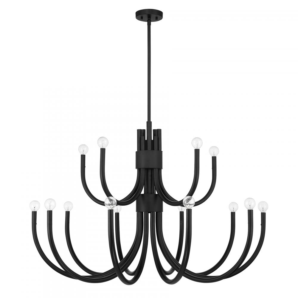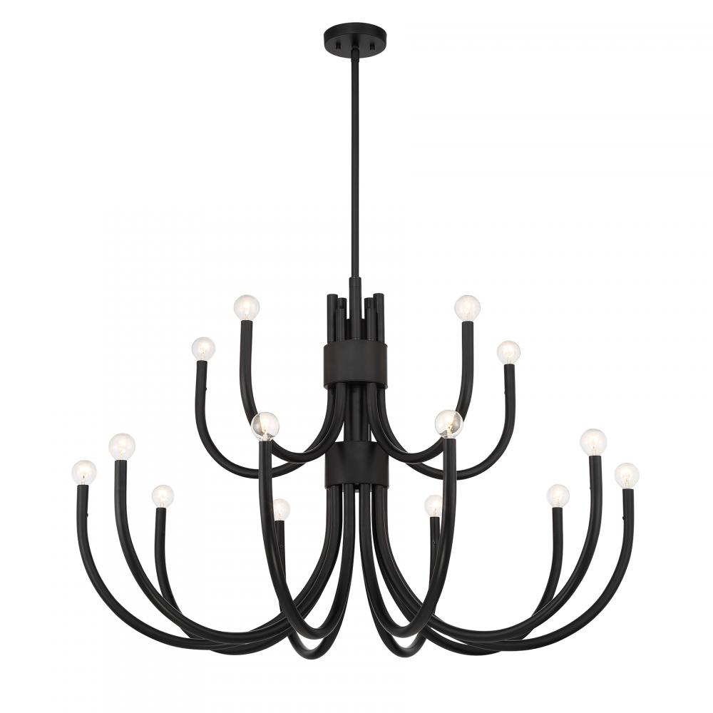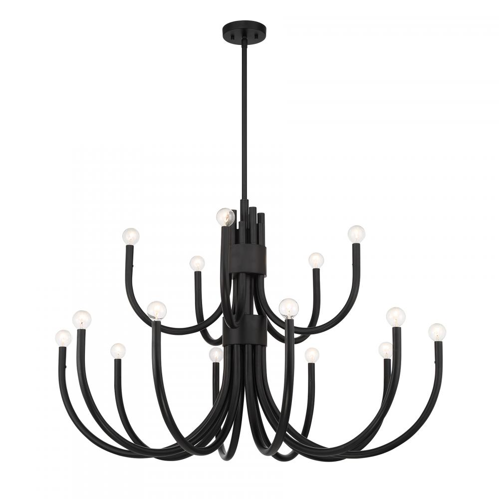 The Savoy House Sorrento 15-light chandelier is sure to stand out in any space! Two tiers of thick tubular arms curve upward and are each topped by an exposed light bulb. The fashionable Matte Black finish looks great with every color or pattern. Sorrento is 42" in width and has an adjustable height ranging from 29" to 83". Comes with four 12" downrods and one 6" downrod. Uses fifteen candelabra size bulbs of up to 60 watts per bulb. Bulbs not included.