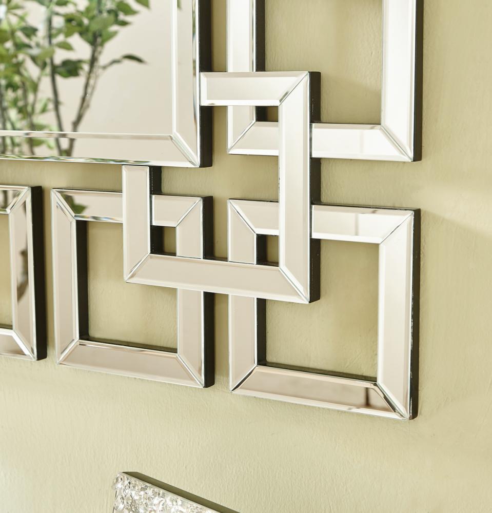 Make a striking statement in your home or office with this stunning contempo style clear mirror. Featuring dozens of expertly cut, beveled edge mirror pieces, layered together to create a bold, yet elegant textured look, you can adorn any promintnt wall with this dazzling contemporary mirror and be sure to catch people’s attention. · Contempo rectangle clear mirror · Mirrors and all surrounding panels are made with beveled edges