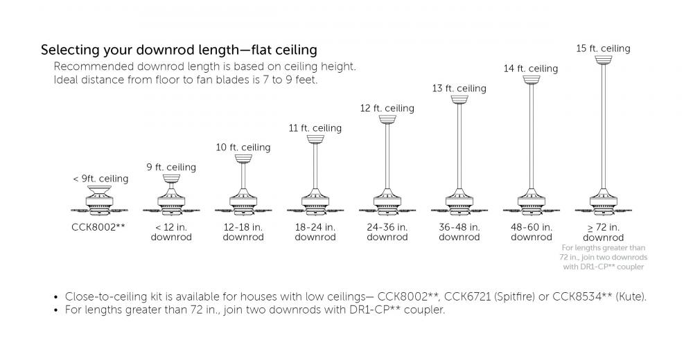 Optional downrods are available in lengths up to 72 inches to adjust the fans height between 7-ft to 9-ft from the floor, ensuring maximum airflow.