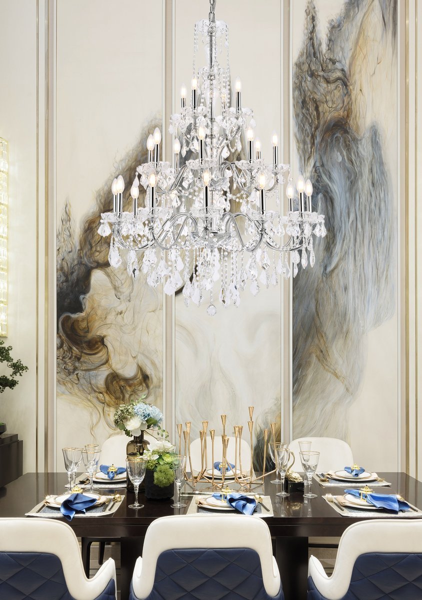 It’s easy to add a magnificent light fixture to your home with chandeliers and pendants from the St. Francis collection. Featuring intricate steel frames with graceful sweeping arms and candelabra-style bulbs (not included), these gorgeous fixtures include a dazzling visual array of delicate crystal bobéches, pendeloques, and beads. Available with a choice of beautiful metal finishes and types of crystal, in a range of diameters from 17 to 36 inches.