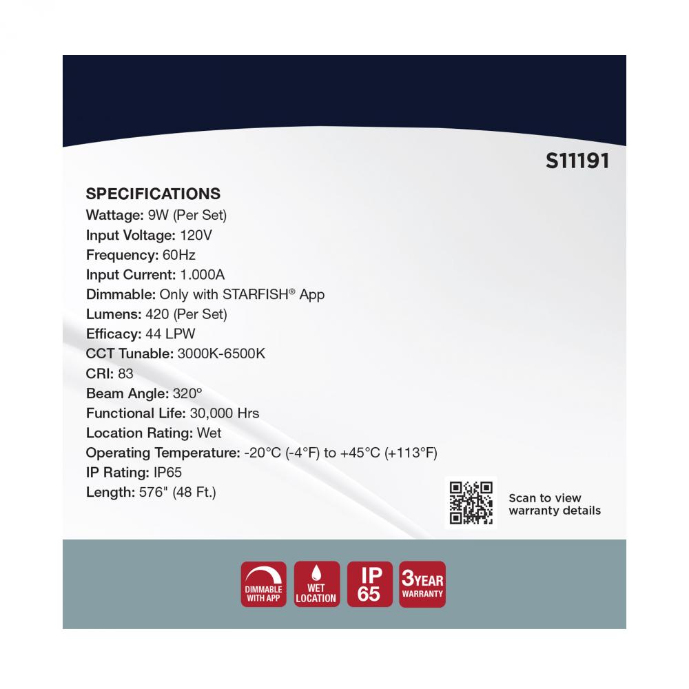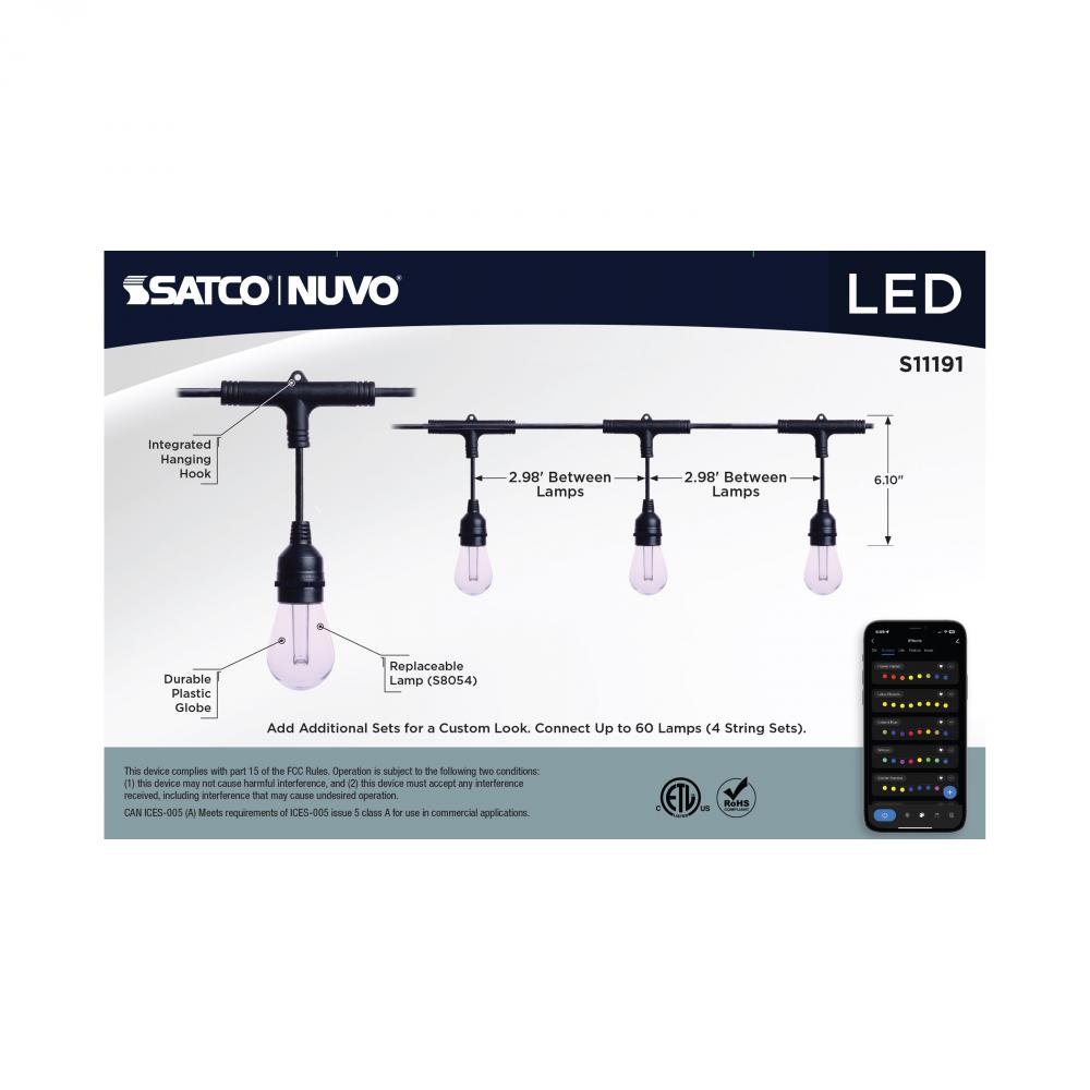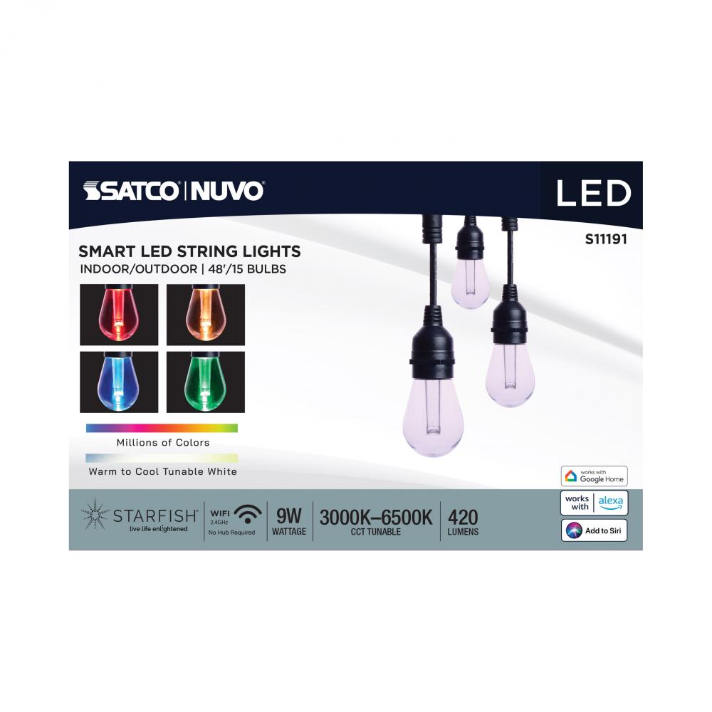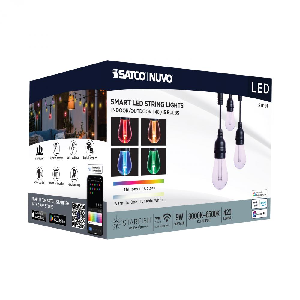 SATCO's S11191 48-foot STARFISH Smart LED String Lights deliver virtually unlimited color selections and control with the STARFISH app. Easily install with the integrated hanging hooks, connect to the app, and tailor the ambiance of your patio, dining