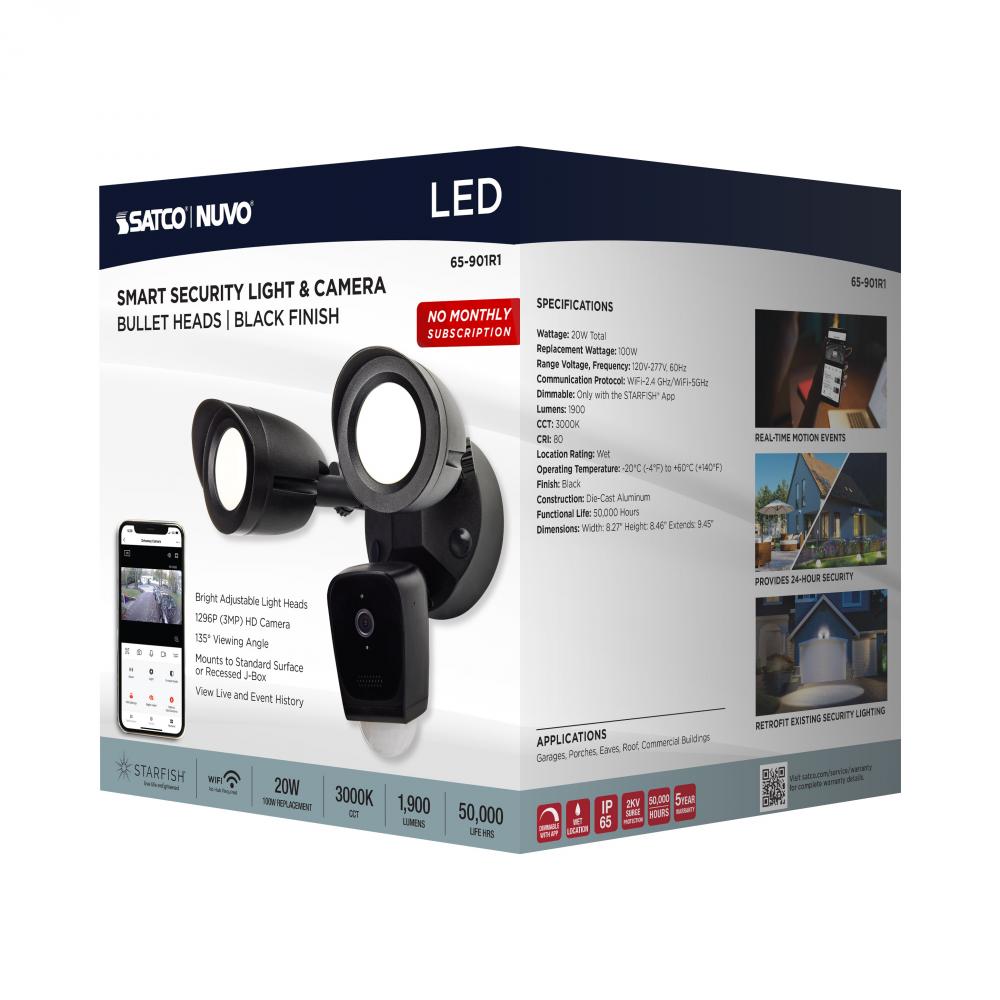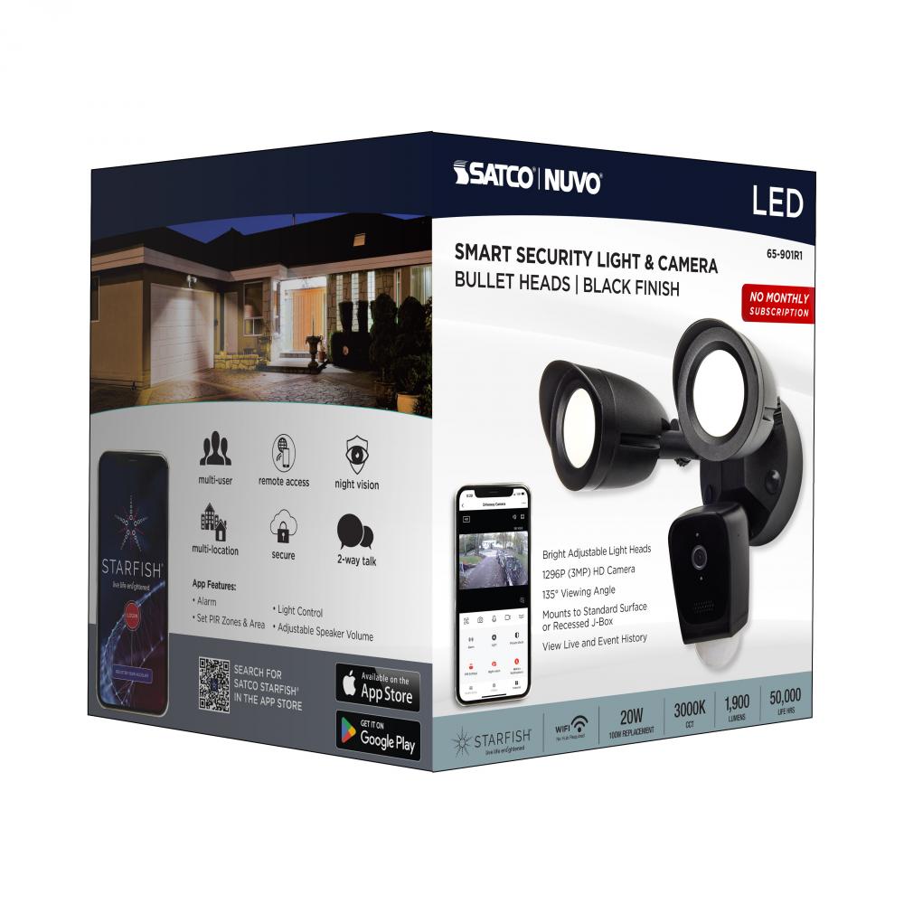 Stay connected and feel protected with SATCO’s 65-901R1 LED security floodlight with STARFISH technology. Featuring a 1296p HD camera with a 135-degree viewing angle, two-way talk, infrared night detection and advanced motion detection settings, you can