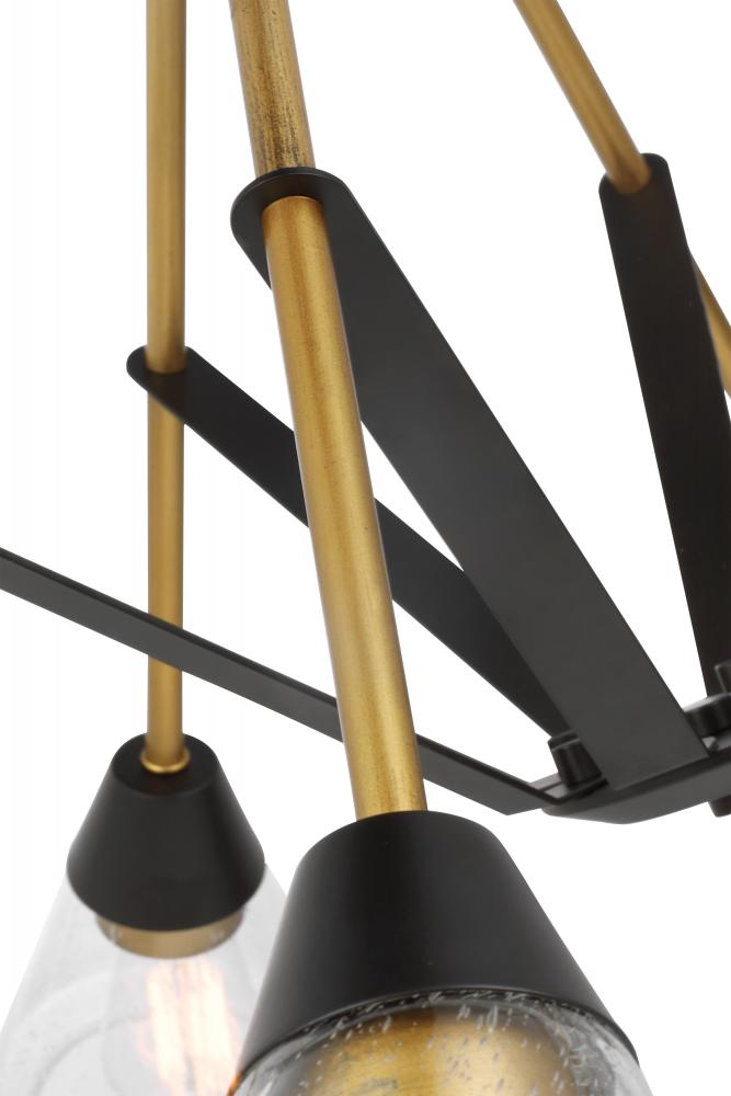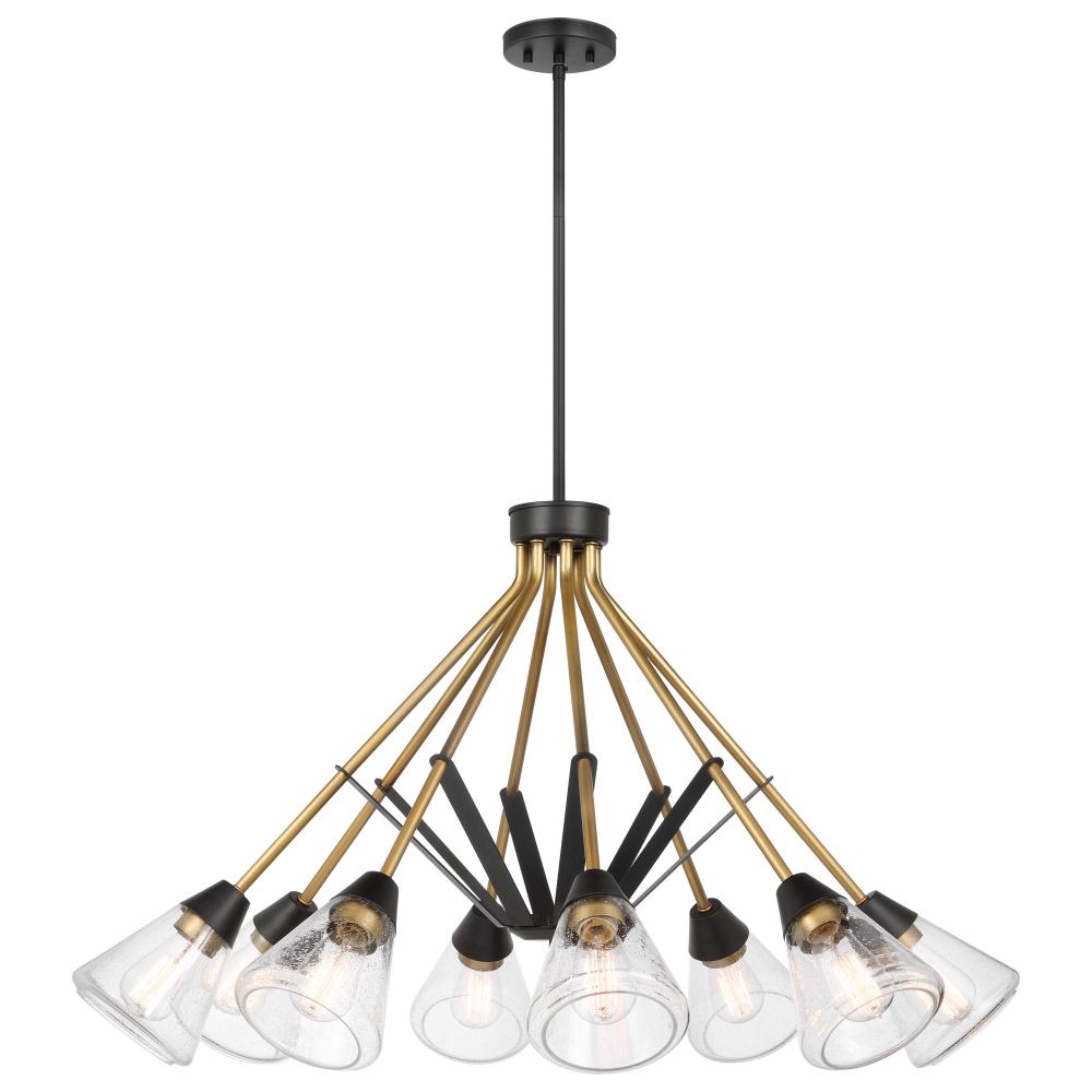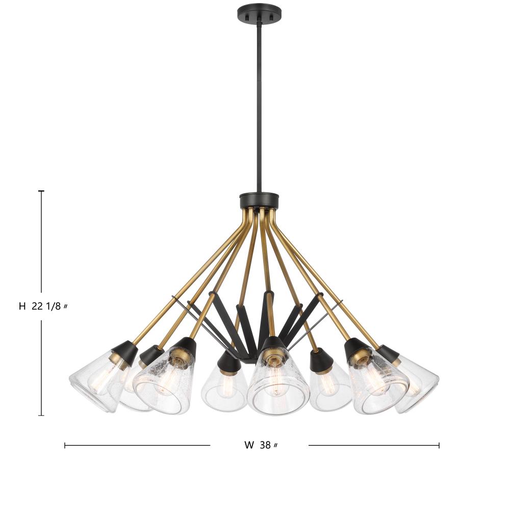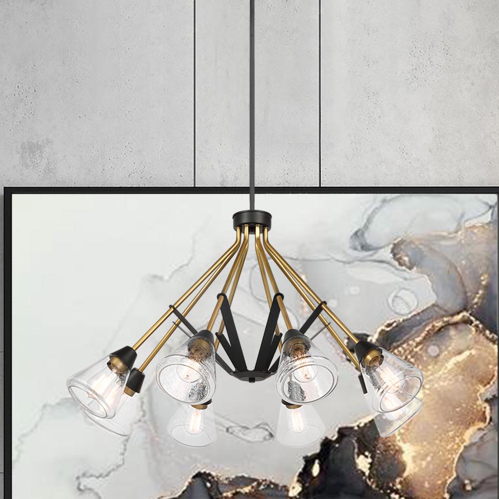 Mid-century charm in a stunning silhouette graces the Starlight 60-7686 eight light chandelier. This design is offered in matte black with a pop of brass, adding interest. The antique -inspired seeded clear glass continues the timeless style throughout the