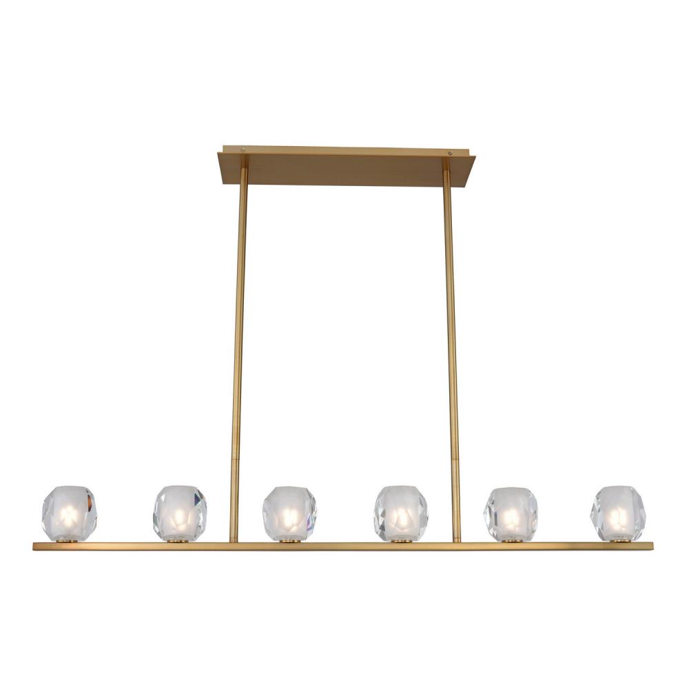 Jewel Cut Frosted Glass rests on a simple steel constructed form in a warm Winter Brass finish. LED G9 bulbs included.
