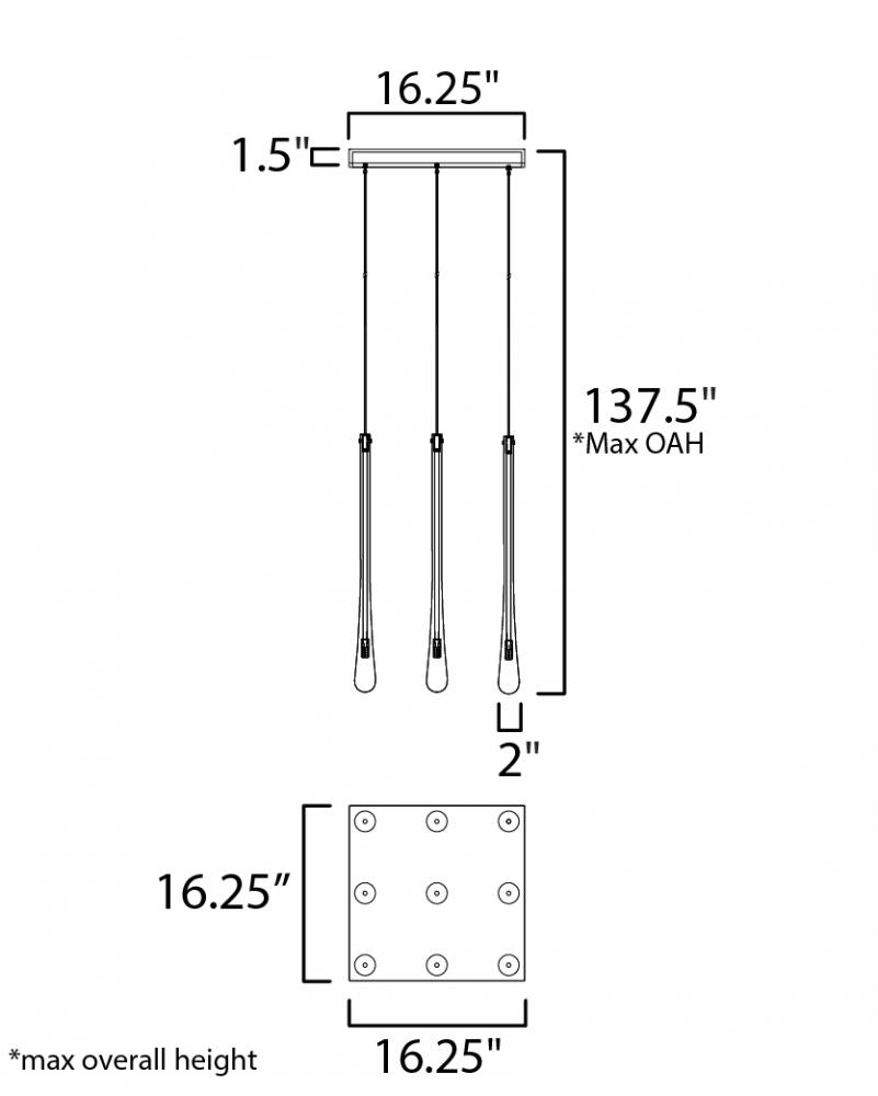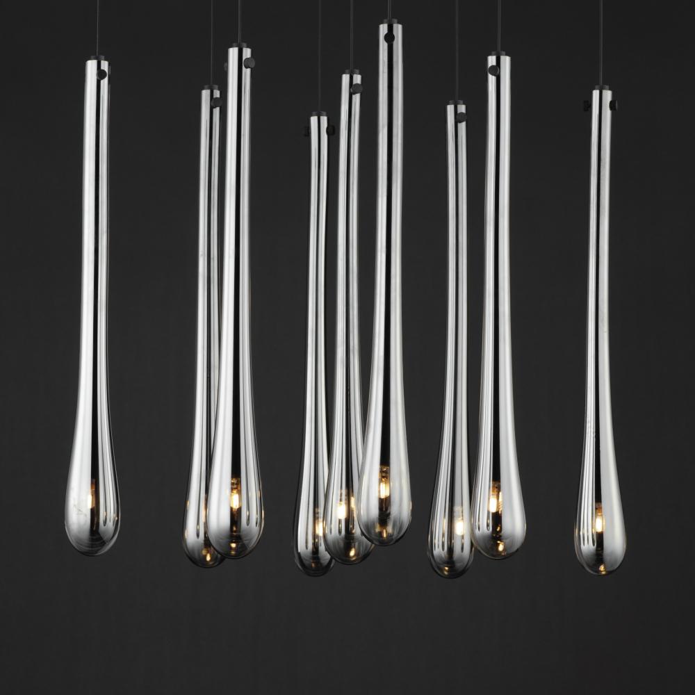 The classic teardrop glass shade is elevated in a luxurious collection of pendant configurations using substantially dense glass that are hand blown in elongated forms and curated into various color combinations. Suspended within the long, slender glass is