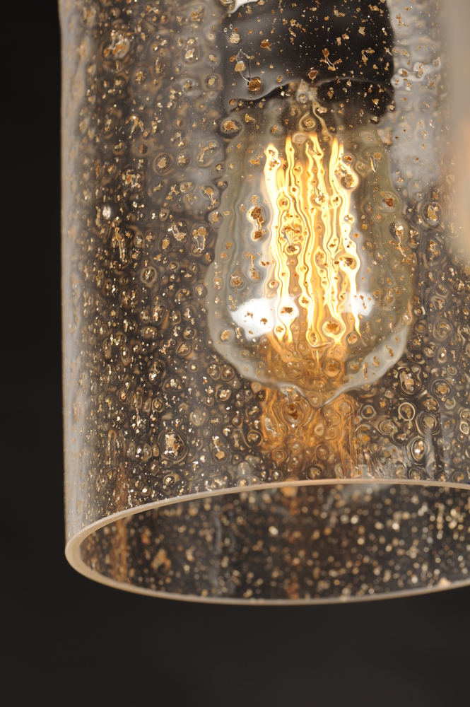 Stone Seeded glass shades with flecks of gold, suspend from a squared loop that cradles a rectangular tube arm finished in a soft Bronze. The minimalistic frame is a perfect complement to the rustic glamour of this glass.