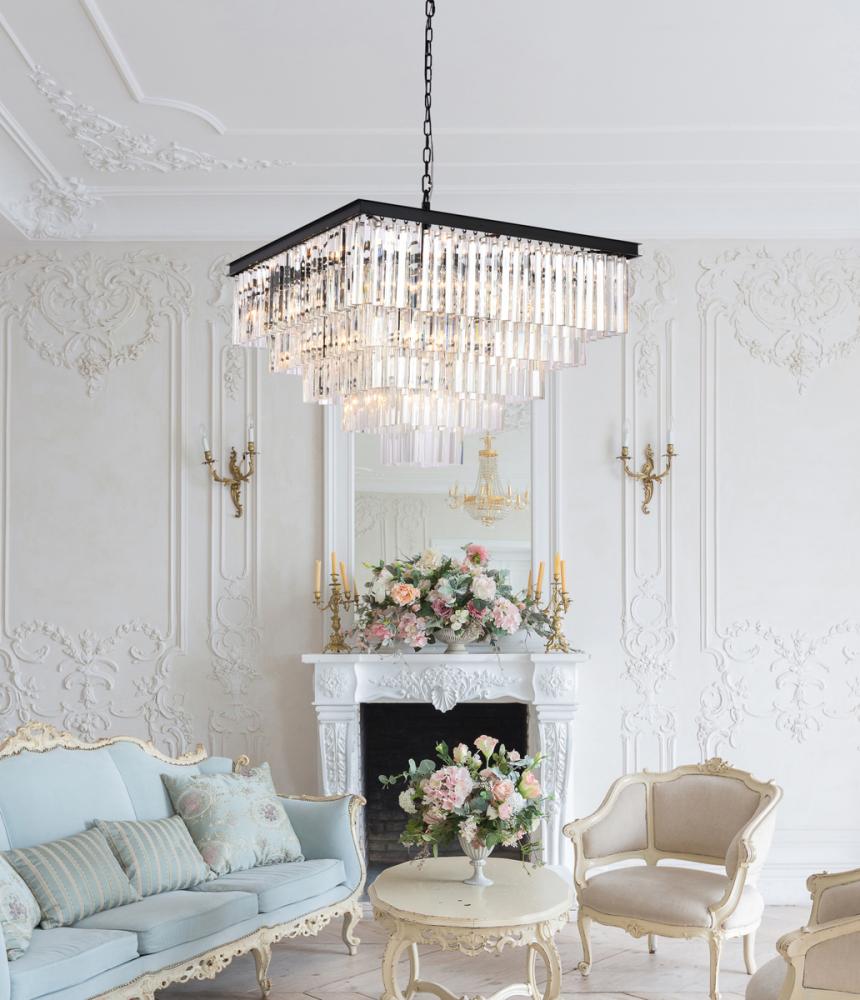 The chandelier features 3 tiers of triangular slender crystal rods, providing a stunning cascade of shimmering light and creating a sense of opulence.