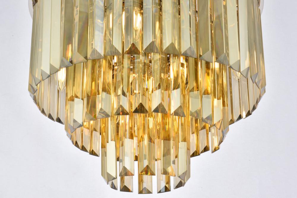 Lamp features a diameter of 20 inches, a height of 16 inches; requires 9 candelabra lights