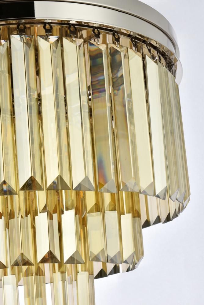 Timeless splendor and modern refinement are brought together in flush-mount Sydney fixtures. Dazzling in dining rooms, staircases, or hallways, the Sydney collection flaunts stunning tiers of royal-cut crystals in clear, golden teak, or Silver shade. A circular mocha-brown or polished-nickel finished steel frame adds understated charm to this stunning flush-mount lamp.