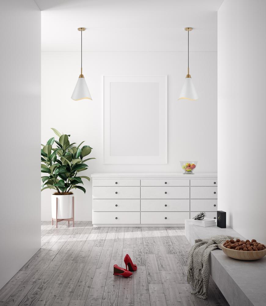 The Tango medium pendant proves that simple style does not have to be boring. It features burnished brass accents on the base, cable collar and canopy giving the design some pop. The matte white metal shade is laser-cut on its edge in a subtle wave pattern