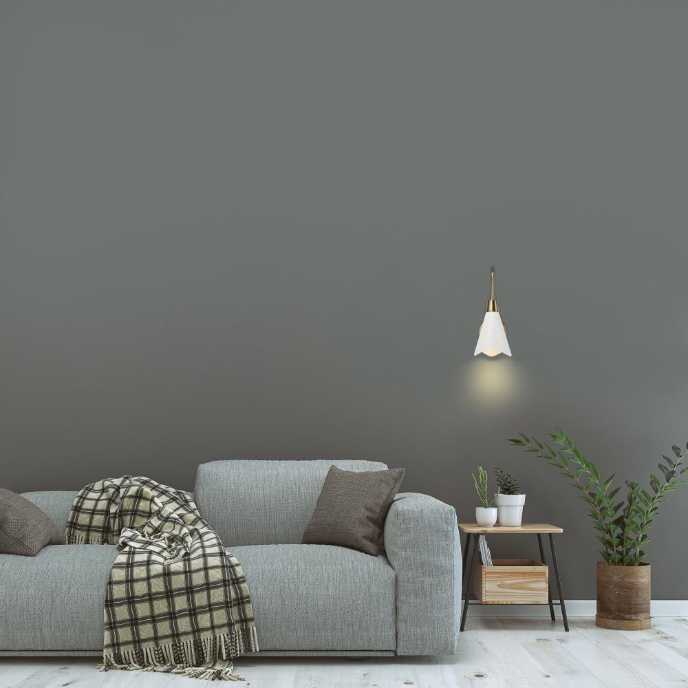 The Tango 60-7468 wall light proves that simple style does not have to be boring. It features burnished brass accents on the backplate, cable cover, and fixture arm, which gives the design some pop. The matte white metal shade is laser-cut on its edge in a
