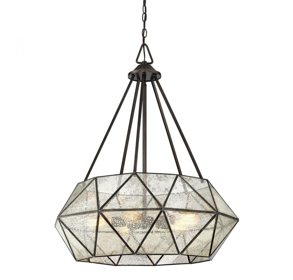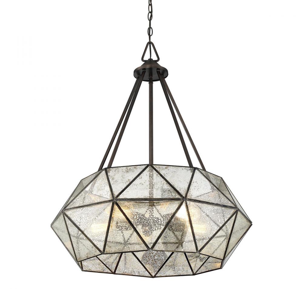 Triangles create drama and the Savoy House Tartan 5-light pendant is no exception! Multiple triangular panes have been fitted together, creating a ring-like form around the central column. Several supporting downrods link the canopy to the frame, forming more triangles. The frame has a sumptuous oiled burnished bronze finish that showcases the bold geometric lines of the pendant and the triangular panes are made of lovely mercury glass, providing even more visual and textural interest. Five 60W candelabra size bulbs shine through the mercury glass to illuminate your room. The pendant measures 28" wide and 34" high, which is an excellent size for dynamic style in your home.