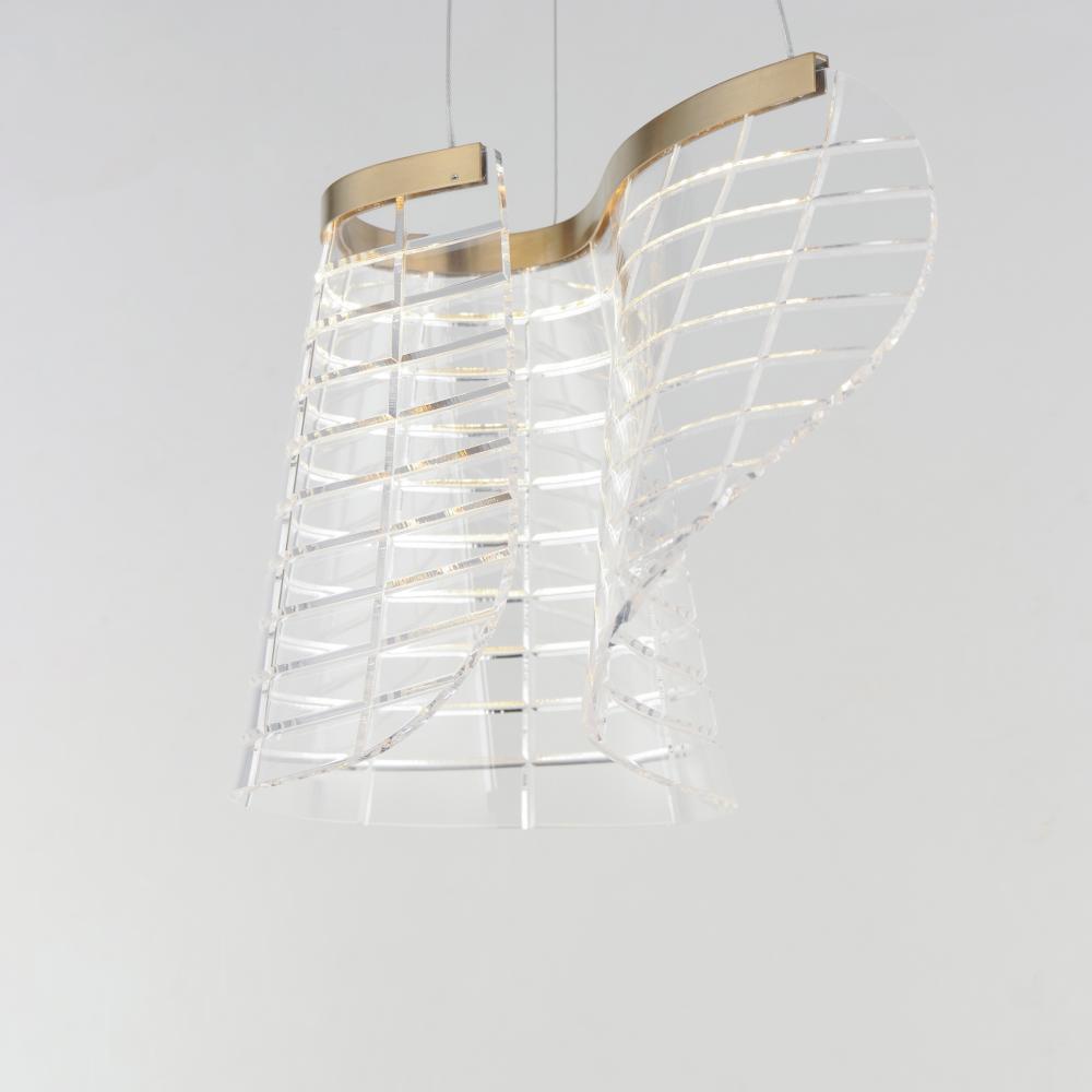 Inspired by patterned fabrics of the Scottish Highlands, the Tartan collection features a waving grid-like design etched deep into the transparent acrylic body. Hand-formed into a curling structure, the material gives the impression of billowing in the bre