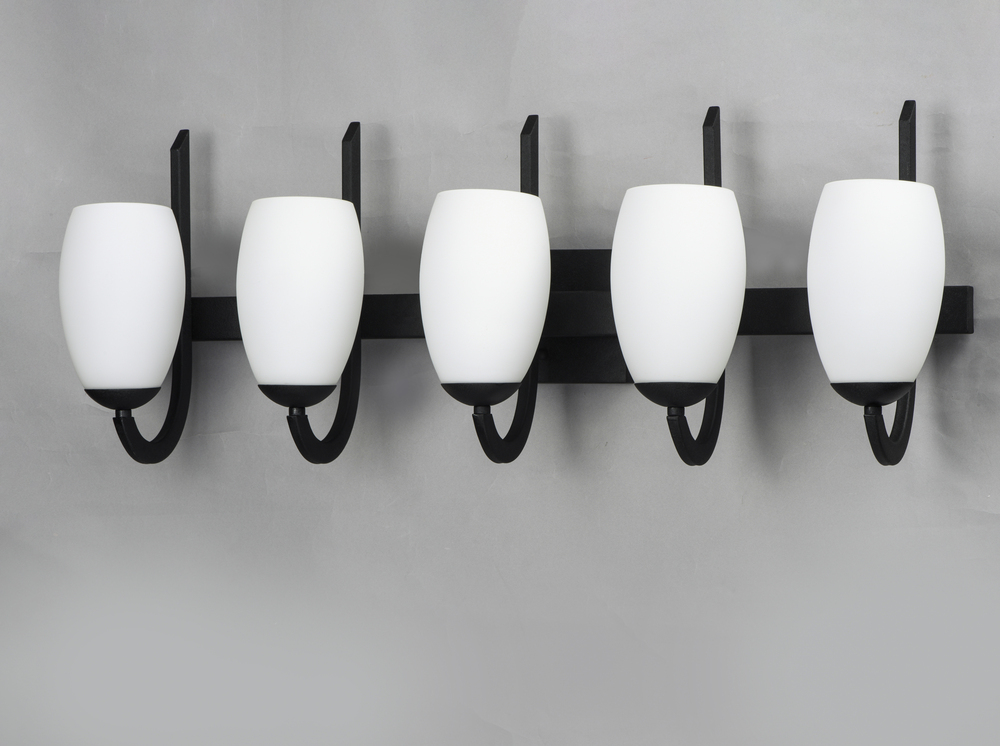 Heavy rectangular tubing support tall scale Satin White glass shades that creates an upscale forged look at a builder price. Available in your choice of Textured Black or Satin Nickel, this collection is complete enough to do the entire home.