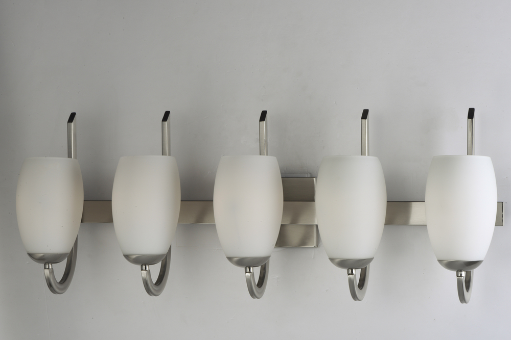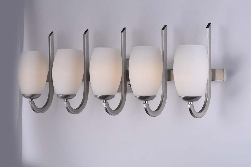 Heavy rectangular tubing support tall scale Satin White glass shades that creates an upscale forged look at a builder price. Available in your choice of Textured Black or Satin Nickel, this collection is complete enough to do the entire home.