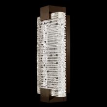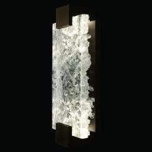Indoor/outdoor aluminum sconce features a three-dimensional contrast of deep textured and polished cast glass. This stunning landscape of the glass, illuminated by waterproof LEDs, is available in clear or highlighted with antiqued gold leaf (shown). Choice of three finishes, champagne tinted gold leaf finish or silver leaf for indoor only, and a hand rubbed black iron for indoor and outdoor use.