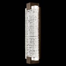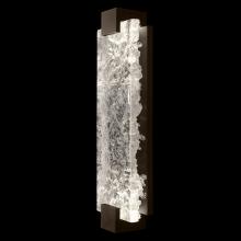 Indoor/outdoor aluminum sconce features a three-dimensional contrast of deep textured and polished cast glass. This stunning landscape of the glass, illuminated by waterproof LEDs, is available in clear or highlighted with antiqued gold leaf (shown). Choice of three finishes, champagne tinted gold leaf finish or silver leaf for indoor only, and a hand rubbed black iron for indoor and outdoor use.