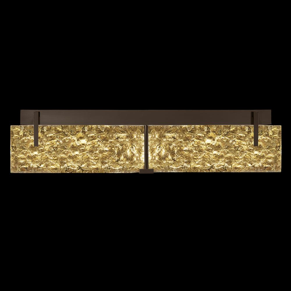 Luxury bath fixture features a three-dimensional contrast of deep textured and polished cast glass. This stunning landscape of the glass, illuminated by waterproof LEDs, is available in clear or highlighted with antiqued gold leaf. Choice of four finishes, champagne tinted gold leaf finish, silver leaf, bronze or hand rubbed black iron. For Indoor use only.
