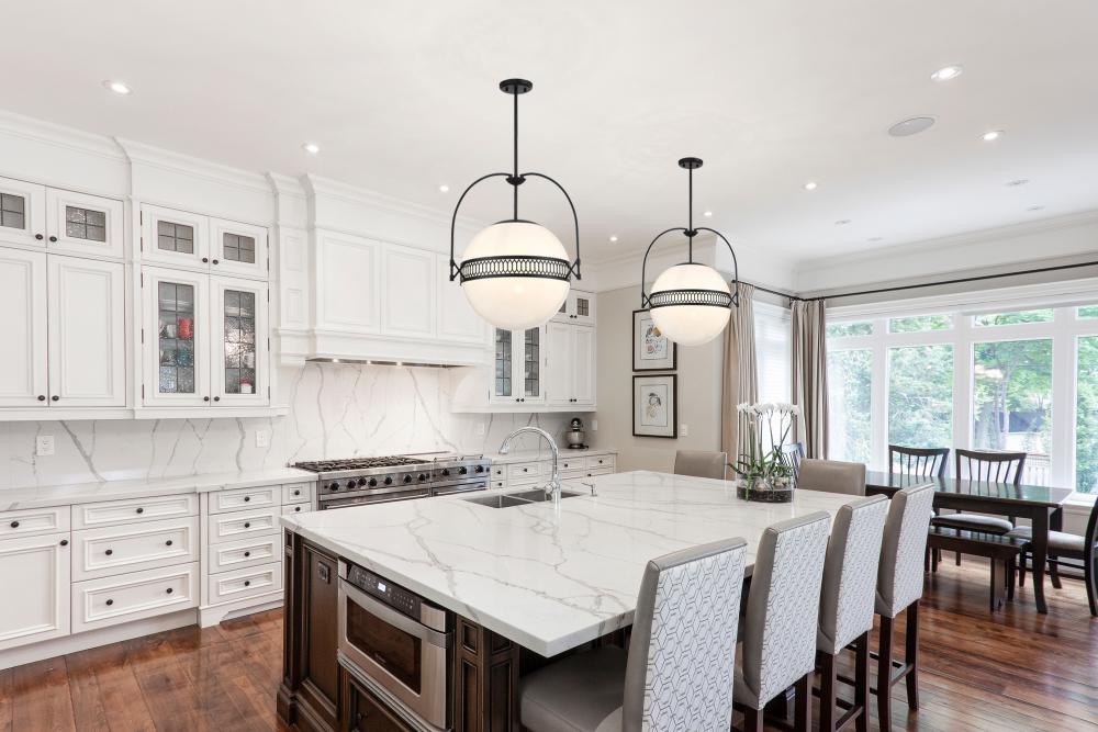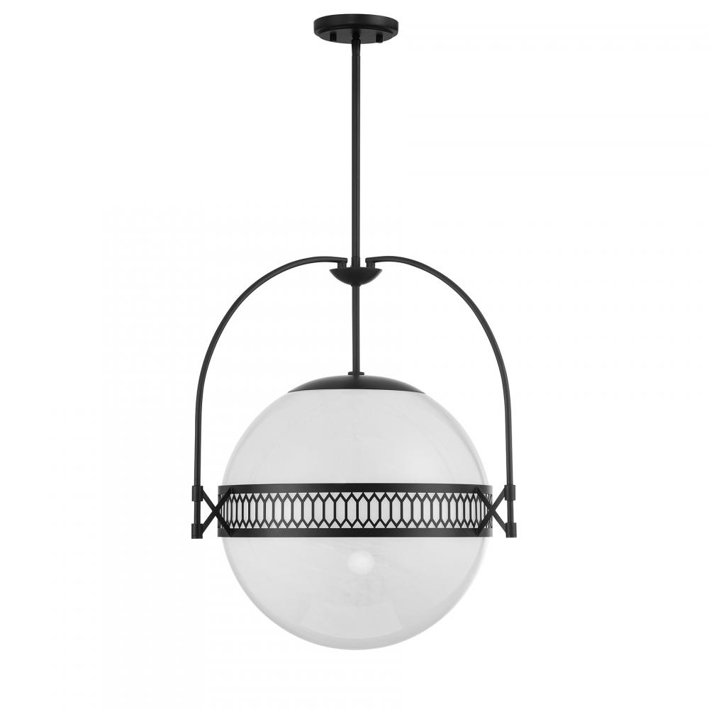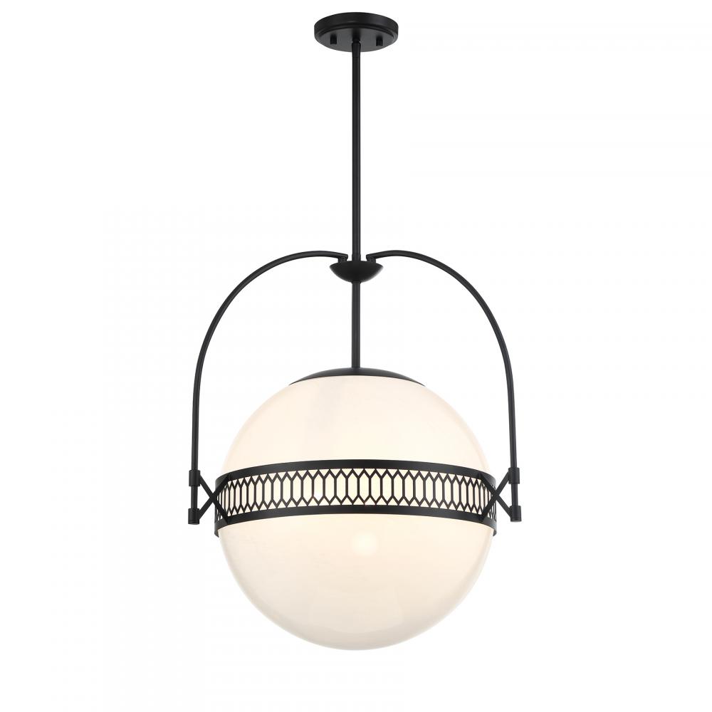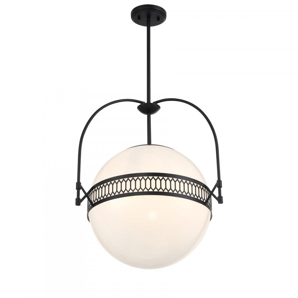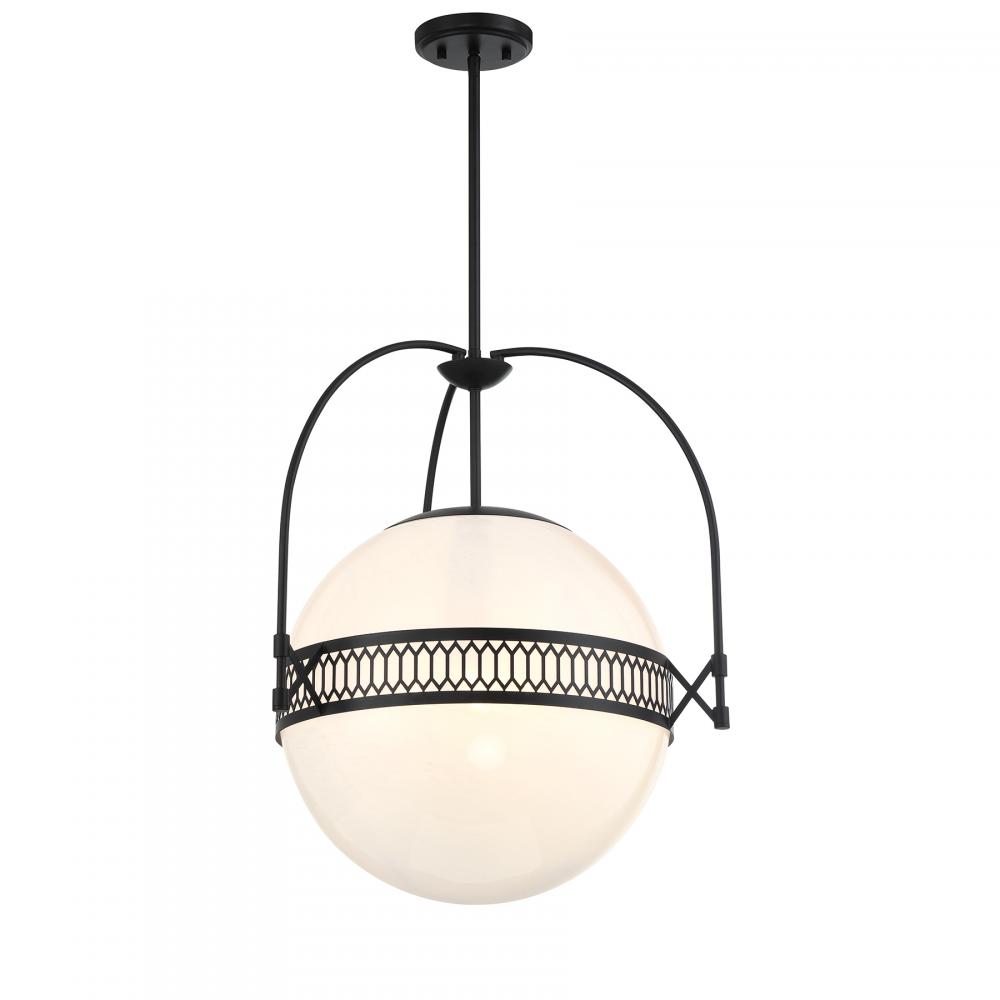 Become mesmerized by the ball of swirling, eye-catching strie glass in the Savoy House Thornhill 3-light pendant. The glass orb is accentuated by elegant picket-shaped detailing and slender, curving arms, all finished in Matte Black. Thornhill is 20" in width and has an adjustable height ranging from 21.5" to 75.5". Comes with four 12" downrods and one 6" downrod. Uses three candelabra size bulbs of up to 60 watts per bulb. Bulbs not included.