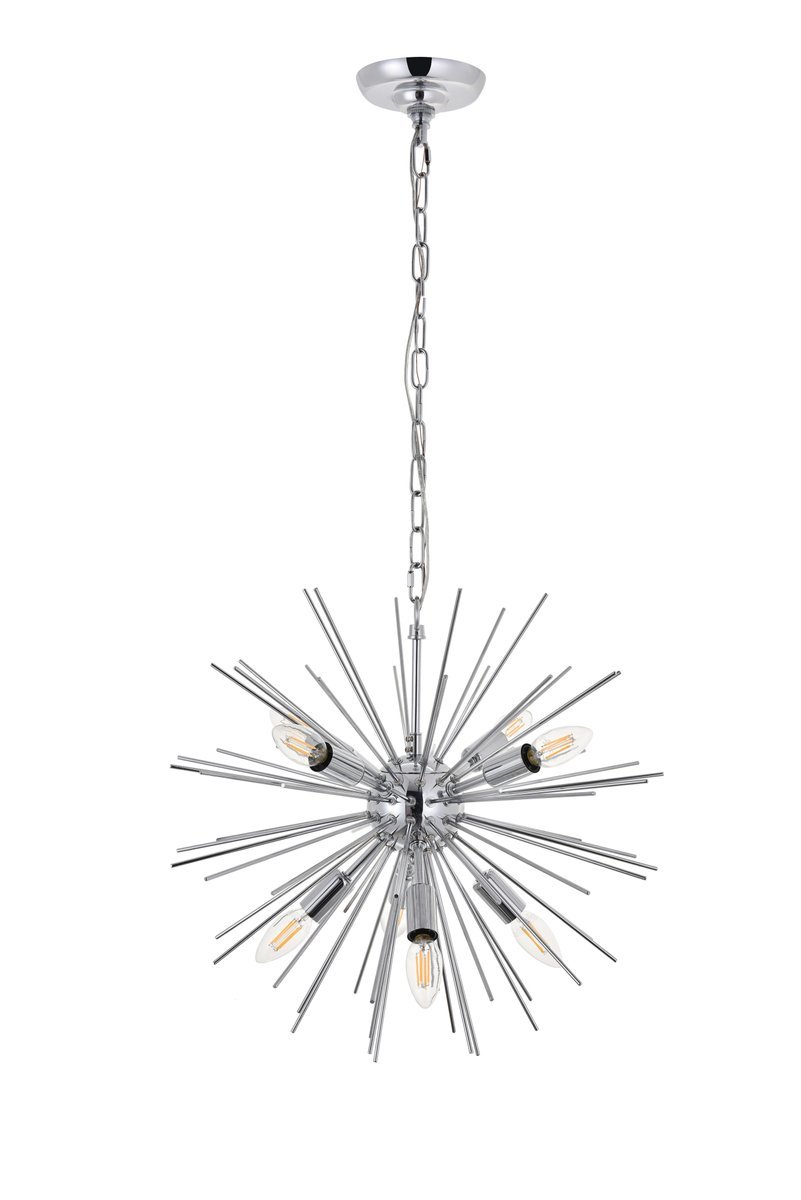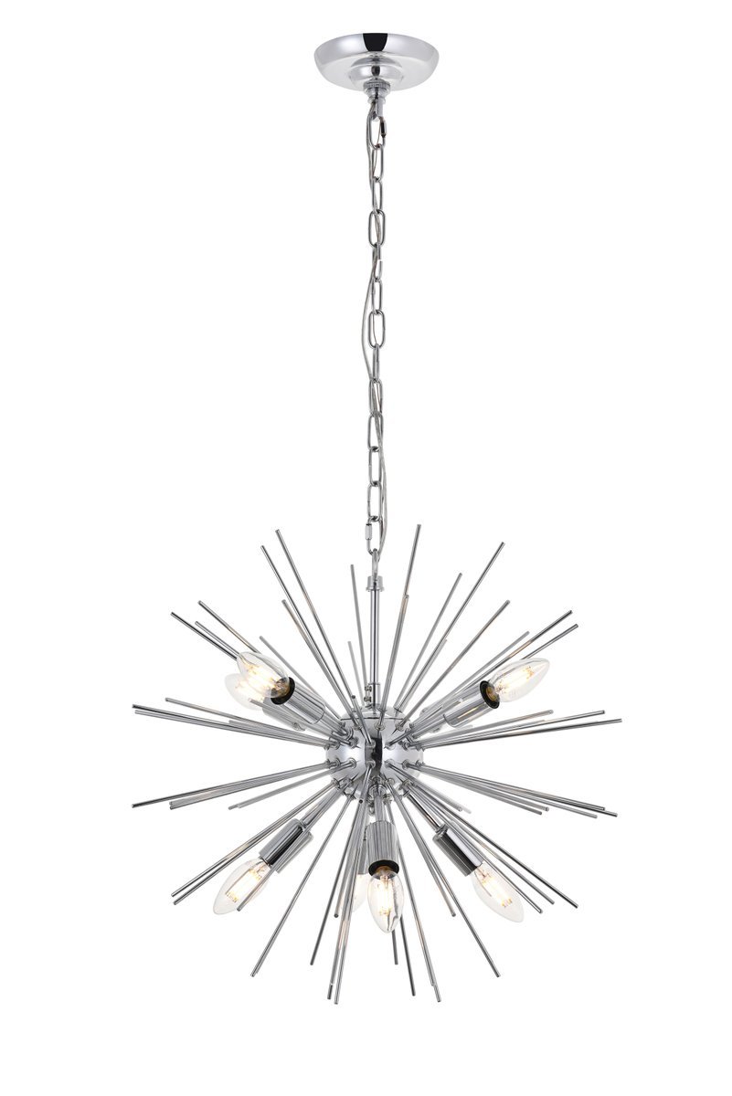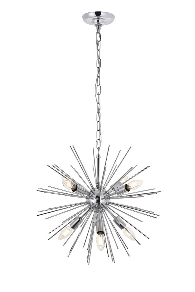 Experience the modern beauty that is the Timber collection pendant lamp in a chrome finish. Its lights are interspersed between a multitude of gleaming slender rods that are as if a firework frozen in mid-air. The contemporary style and unorthodox design makes it a wonderful statement lighting choice for your home--whether it hangs in the entry way, livens up the living room, or sets the mood at your home bar.