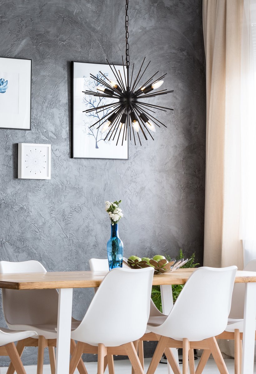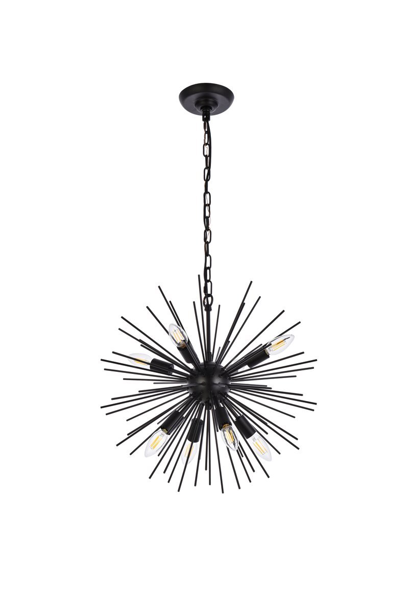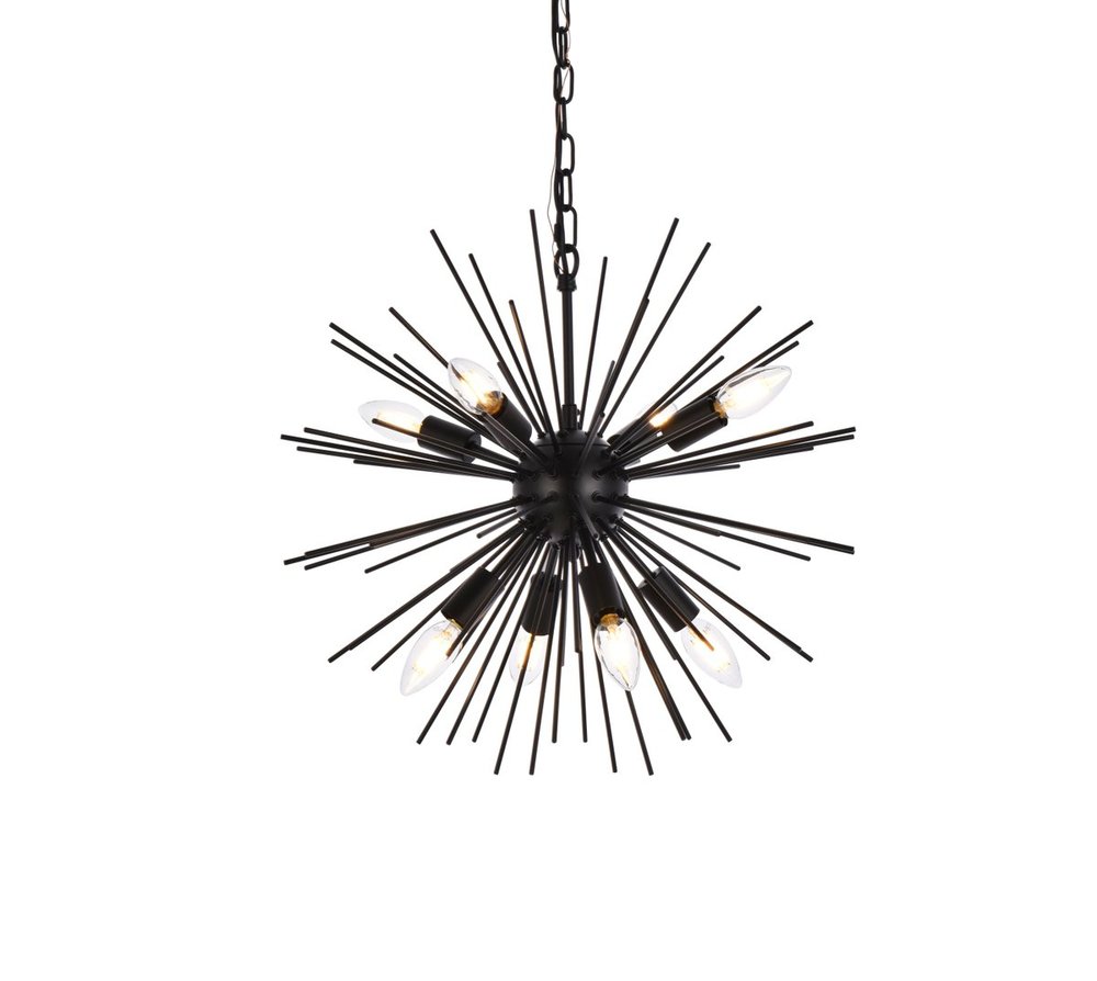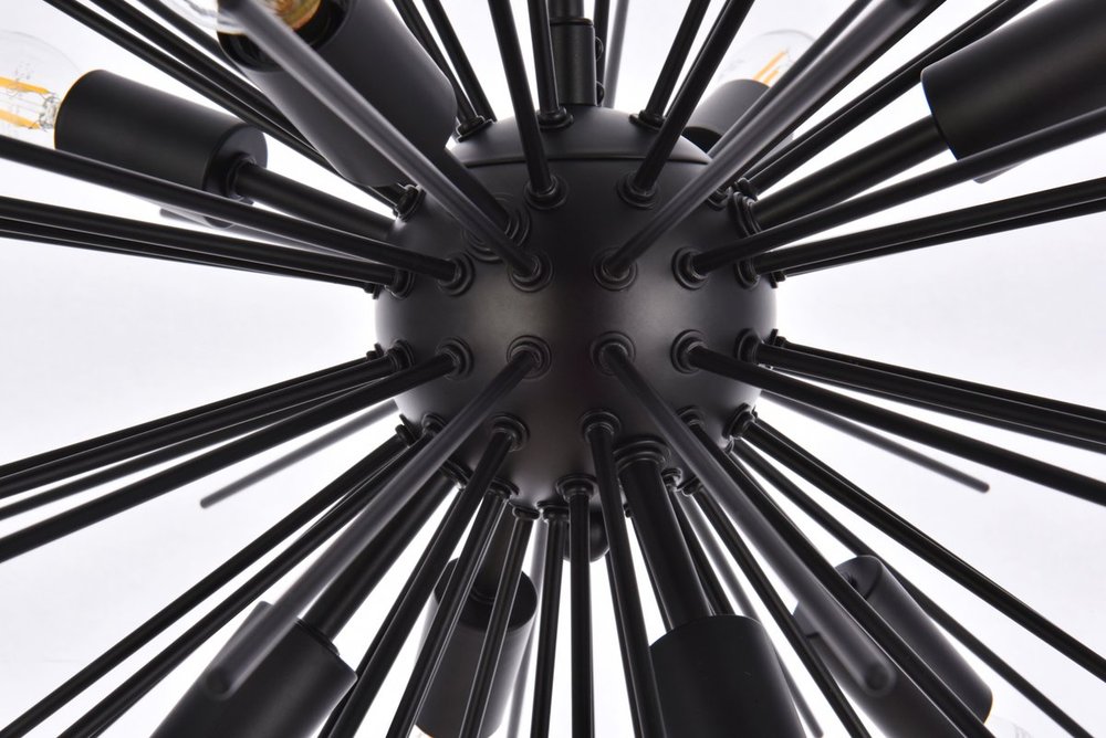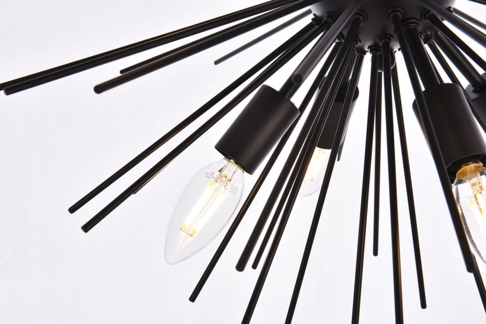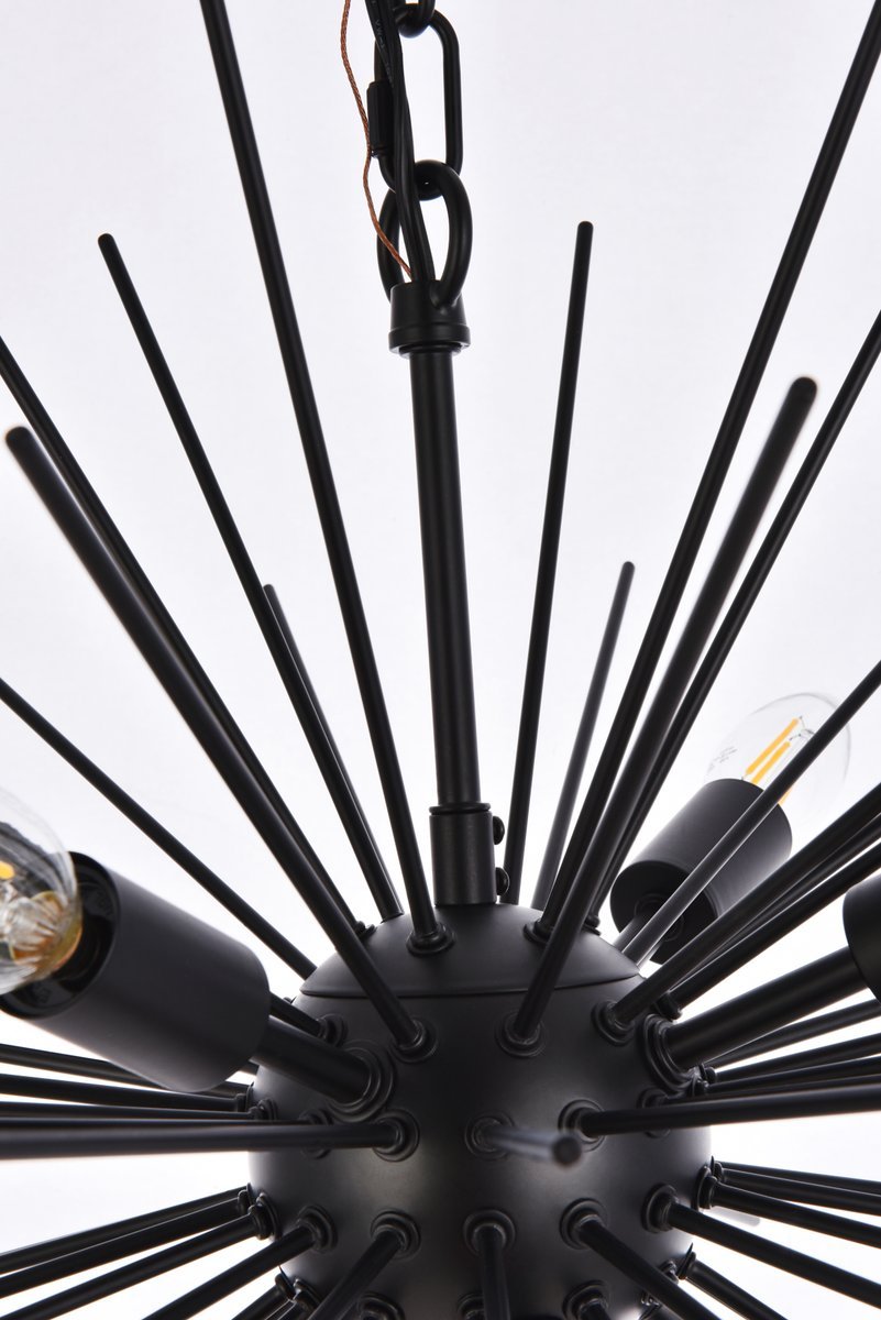 Black finish pendant with 8 lights and a myriad of black finish rods extending from center