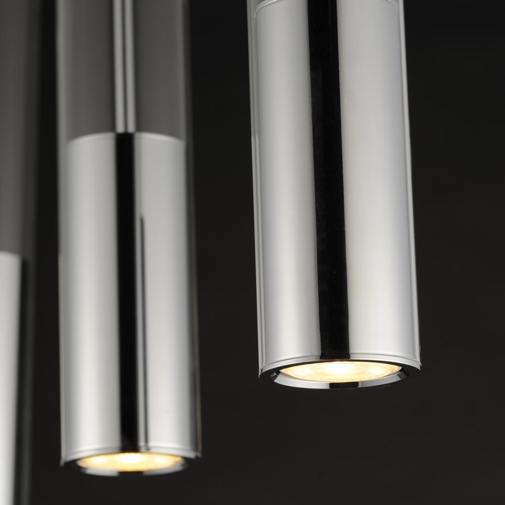 Machined Aluminum tubes of Black, Polished Chrome, or Brass suspend within clear glass overlays. An LED GU10 bulb is recessed within the metal tube providing great directional lighting. Available as a single pendant or as a 4-Light linear pendant.