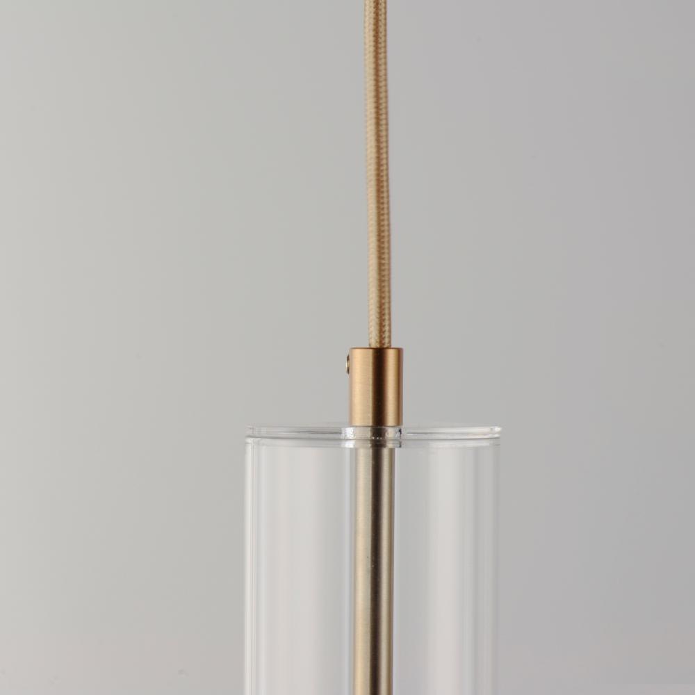 Machined Aluminum tubes of Black, Polished Chrome, or Brass suspend within clear glass overlays. An LED GU10 bulb is recessed within the metal tube providing great directional lighting. Available as a single pendant or as a 4-Light linear pendant.