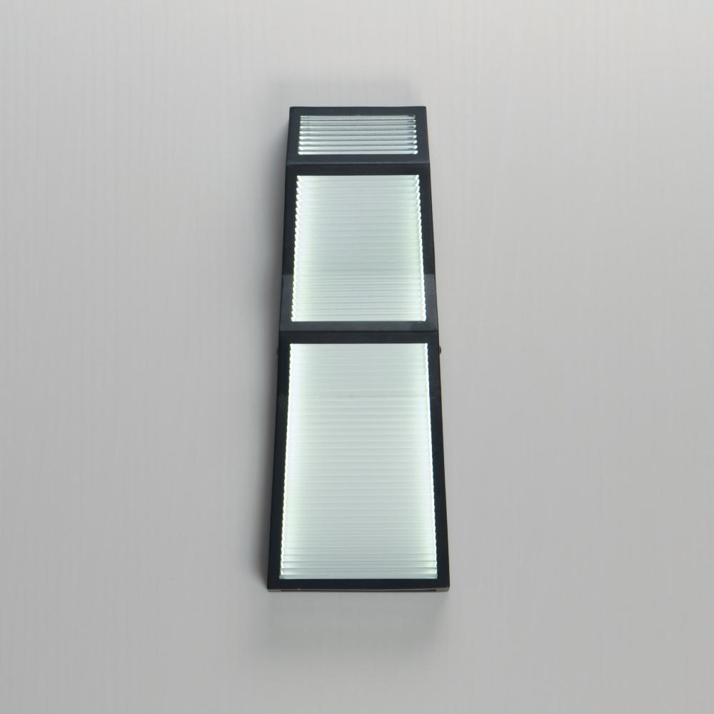 Zigzag towers of ribbed glass and a textured black frame. The ribbed glass texture is back lit by integrated LED strips housed within that shine bright illumination against a white reflective backdrop. With a 3" extension, these wall sconces add visual