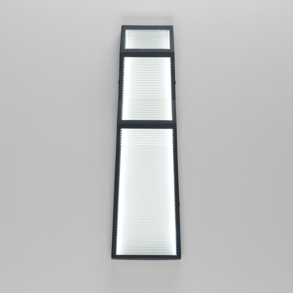 Zigzag towers of ribbed glass and a textured black frame. The ribbed glass texture is back lit by integrated LED strips housed within that shine bright illumination against a white reflective backdrop. With a 3" extension, these wall sconces add visual