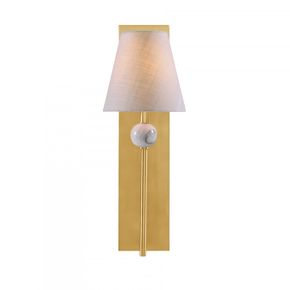 The effortlessly elegant Savoy House Travis 1-light sconce showcases a special touch – an orb of beautiful natural white marble with dark veining. Each piece of marble is unique and will have different veining patterns. This marble takes center stage in an otherwise subtle and understated design. A white fabric shade provides comfortable light while a Warm Brass finish adds brightness. Travis is 22" in height, 7.5" in width and extends 8.5" from the wall. Uses one candelabra size bulb of up to 60 watts. The bulb is not included.