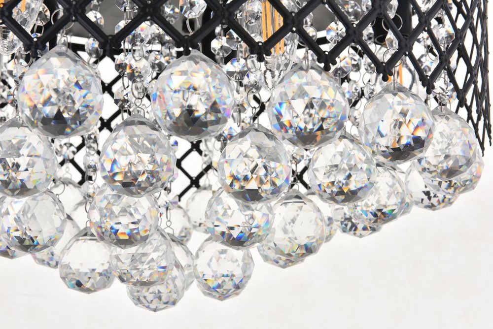 Matte black finish flush mount with lattice shade decorated with florets and strands of crystals and suspended faceted crystal balls