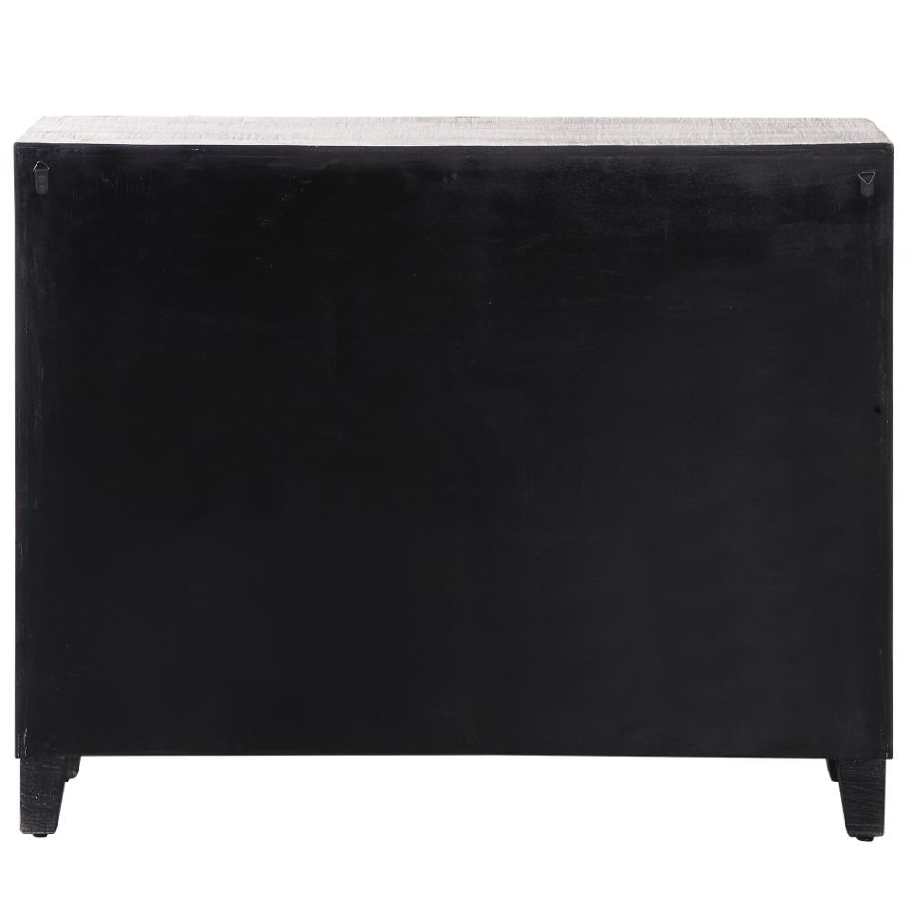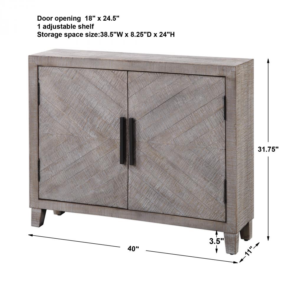 This Modern Farmhouse Two Door Cabinet Features Linear Textured Fir Wood, Finished in A White Washed Glaze with Oatmeal Undertones. Antique Bronze Iron Door Pulls Open to One Fixed Shelf.