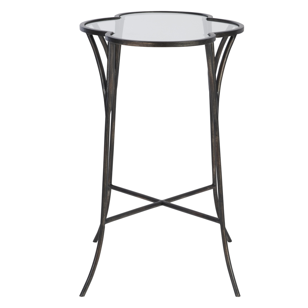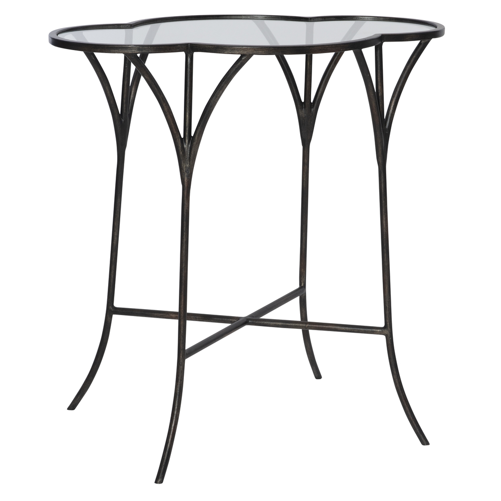 Whimsically Designed with Moroccan Roots, This Accent Table Features A Hand Forged Iron Framework Finished in Aged Black with A Scalloped Top with Clear Tempered Glass.