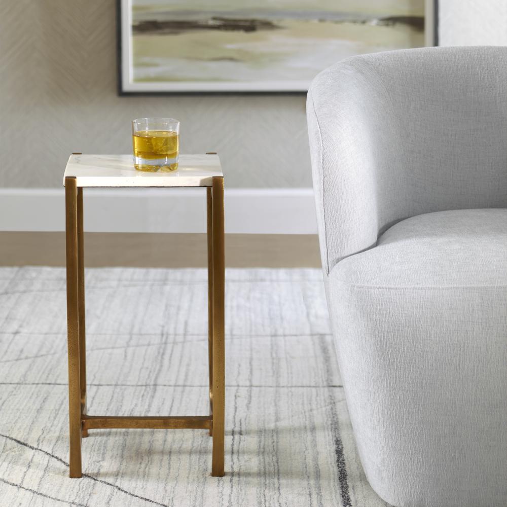 With Understated Sophistication, The Affinity Accent Table Complements With Ease. Featuring A Shapely Cast Aluminum Base In Antique Gold That Encapsulates A Natural White Marble Top. True To The Nature Of Natural Materials, Each Piece Will Have Unique Marbling And Veining Throughout.