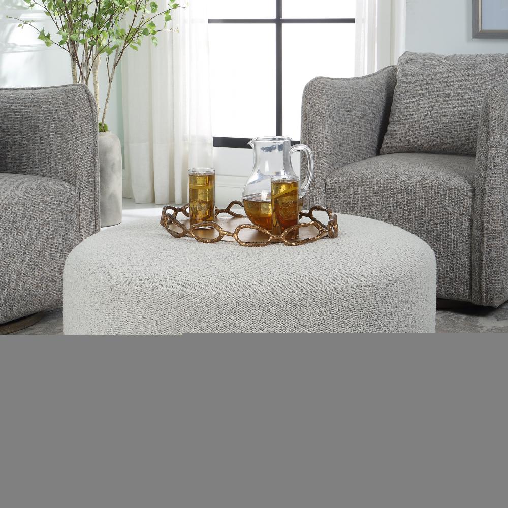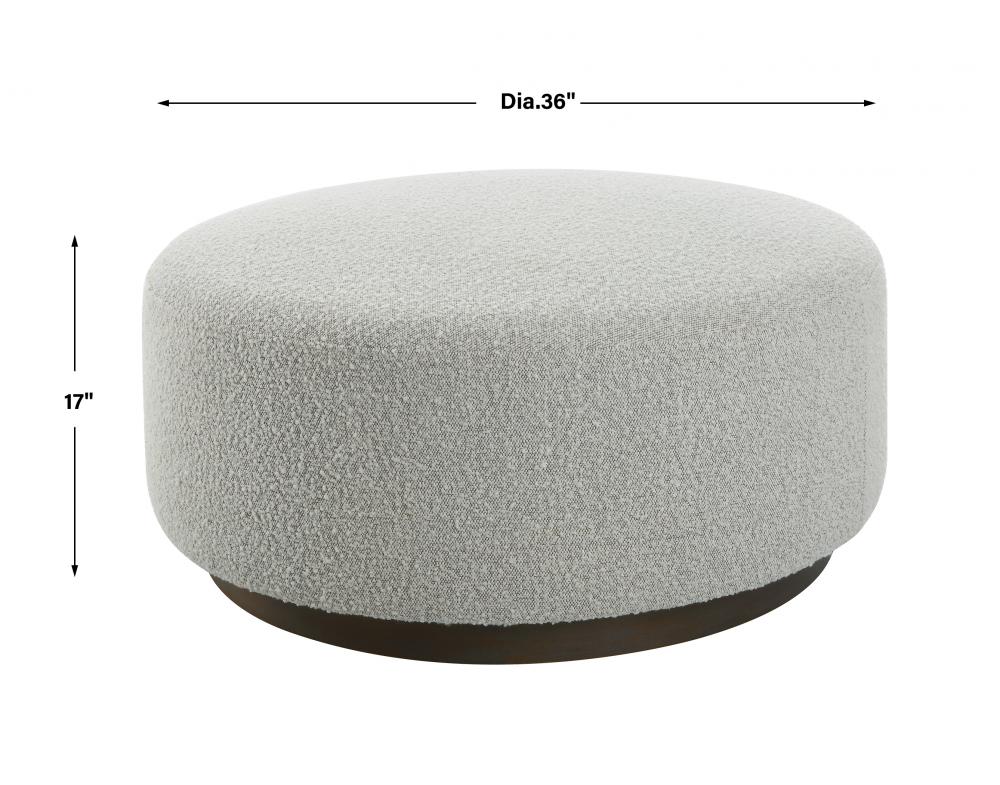 This Plush Ottoman is Covered in A Casual Ivory and Warm Gray Boucle Fabric with A Natural Walnut Stained Wood Base. Perfect As A Coffee Table Topped with An Oversized Tray.