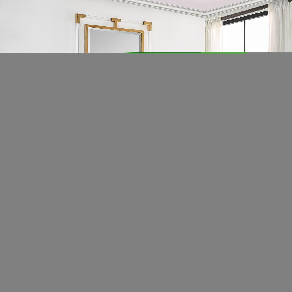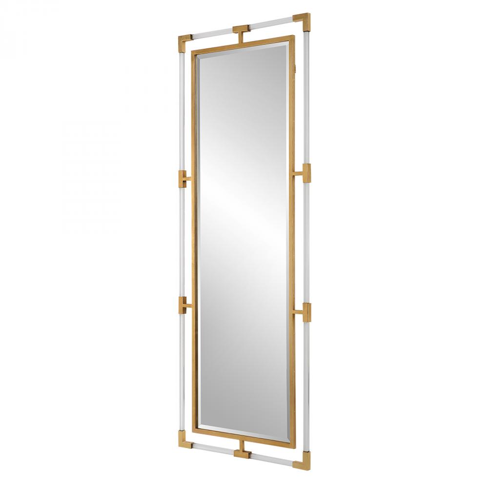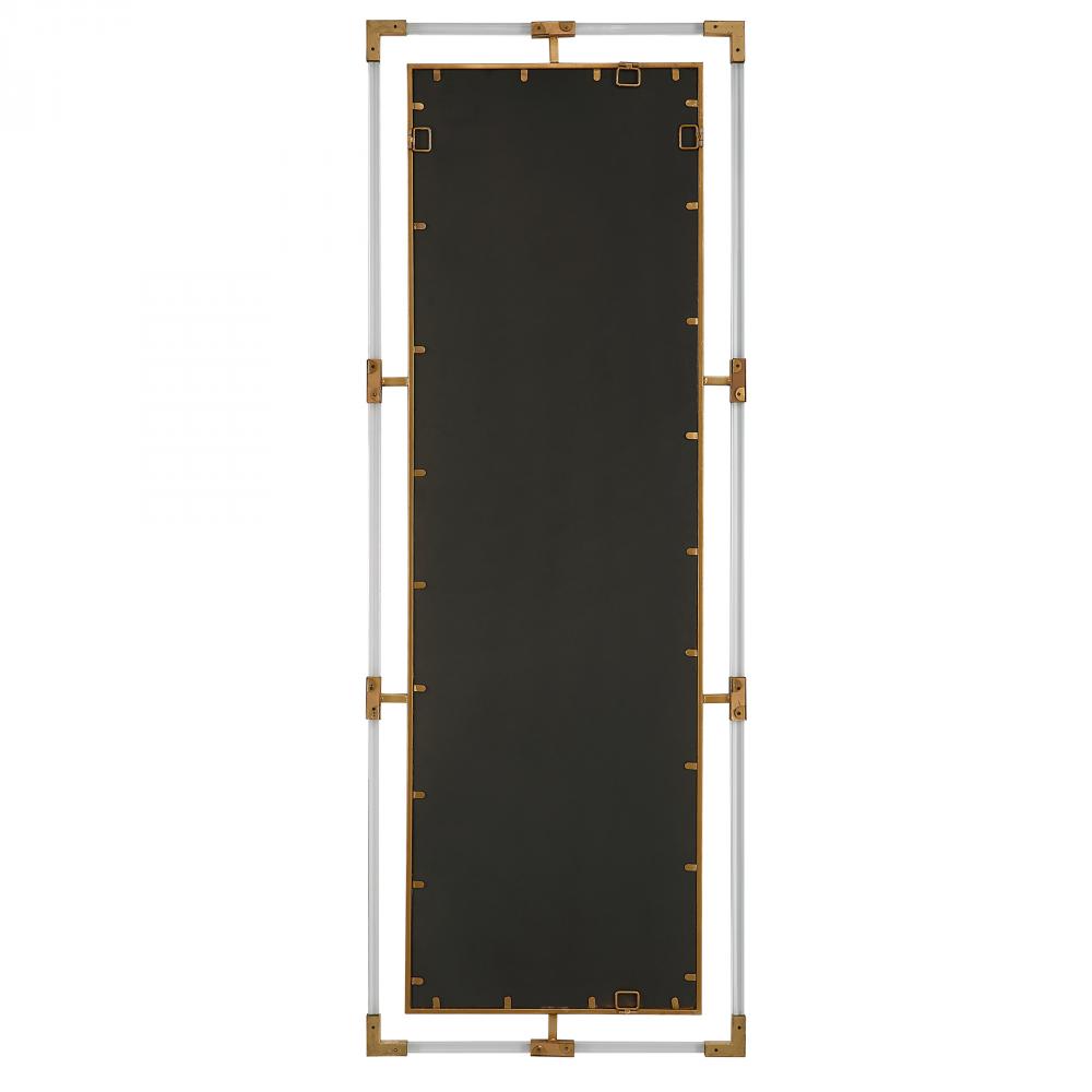 The Balkan Tall Mirror Features Forged Iron Finished in A Metallic Gold Leaf with Suspended, Clear Acrylic Solid Bars Creating A Modern Feel. Mirror Has A Generous 1 1/4" Bevel and May Be Hung Horizontal or Vertical.