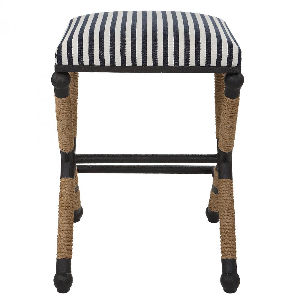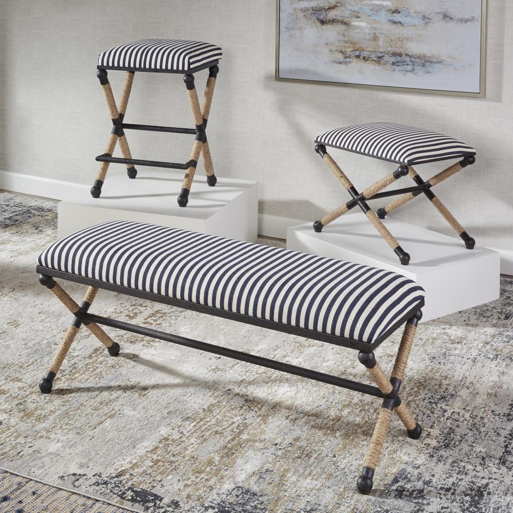 Rustic Iron Frame with A Nautical Touch, Wrapped in Natural Fiber Rope Accents. Cushioned Top is A Sturdy, Sailor-striped Cotton in Crisp Navy and Cream with Performance Treatment. Seat Height is 28".