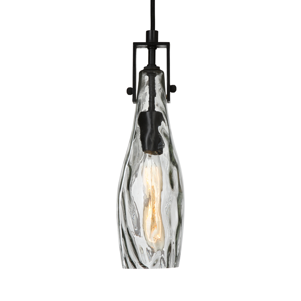 Transitional Pendant in A Matte Black Finish with A Flat Clear Teardrop-shaped Watered Glass. From The Front View, It is A Teardrop Shape and From The Side, It is Only 4" Wide and Flat in Appearance. 1-60 Watt Max Edison Socket. Bulbs Not Included. Supplied with Black 15' Cord and Black Canopy.