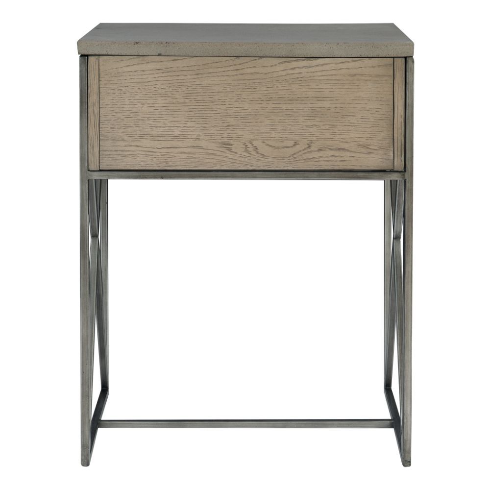 Showcasing A Blend of Tonal Mixed Media Elements, This Side Table is Wrapped in A Soft Mushroom Gray Oak Veneer with A Brushed Pewter X Base, and Topped with An Aged Gray Concrete Slab. Has One Storage Drawer with Coordinating Brushed Pewter Bar Hardware.